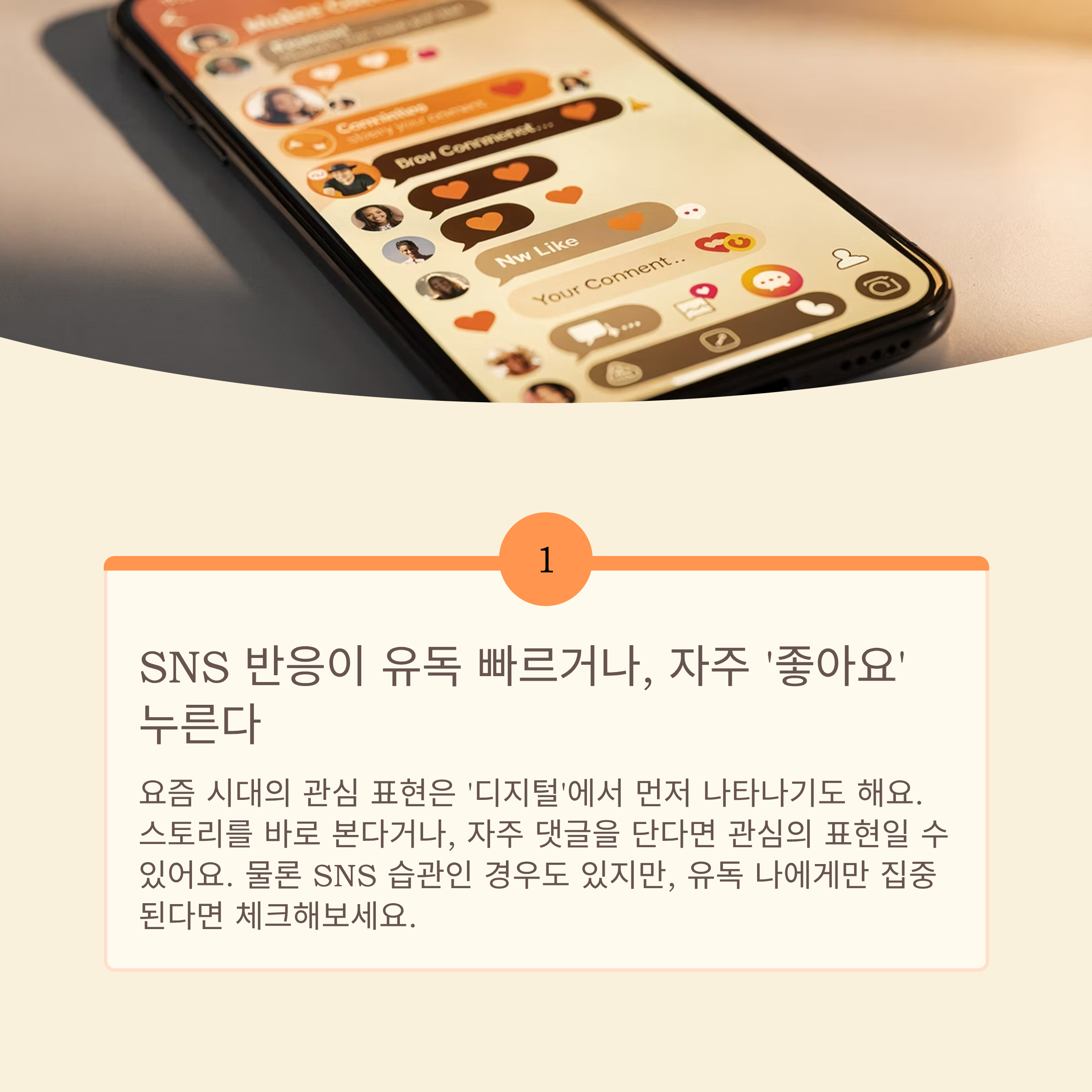요즘 시대의 관심 표현은 ‘디지털’에서 먼저 나타나기도 해요. 스토리를 바로 본다거나, 자주 댓글을 단다면 관심의 표현일 수 있어요. 물론 SNS 습관인 경우도 있지만, 유독 나에게만 집중된다면 체크해보세요.