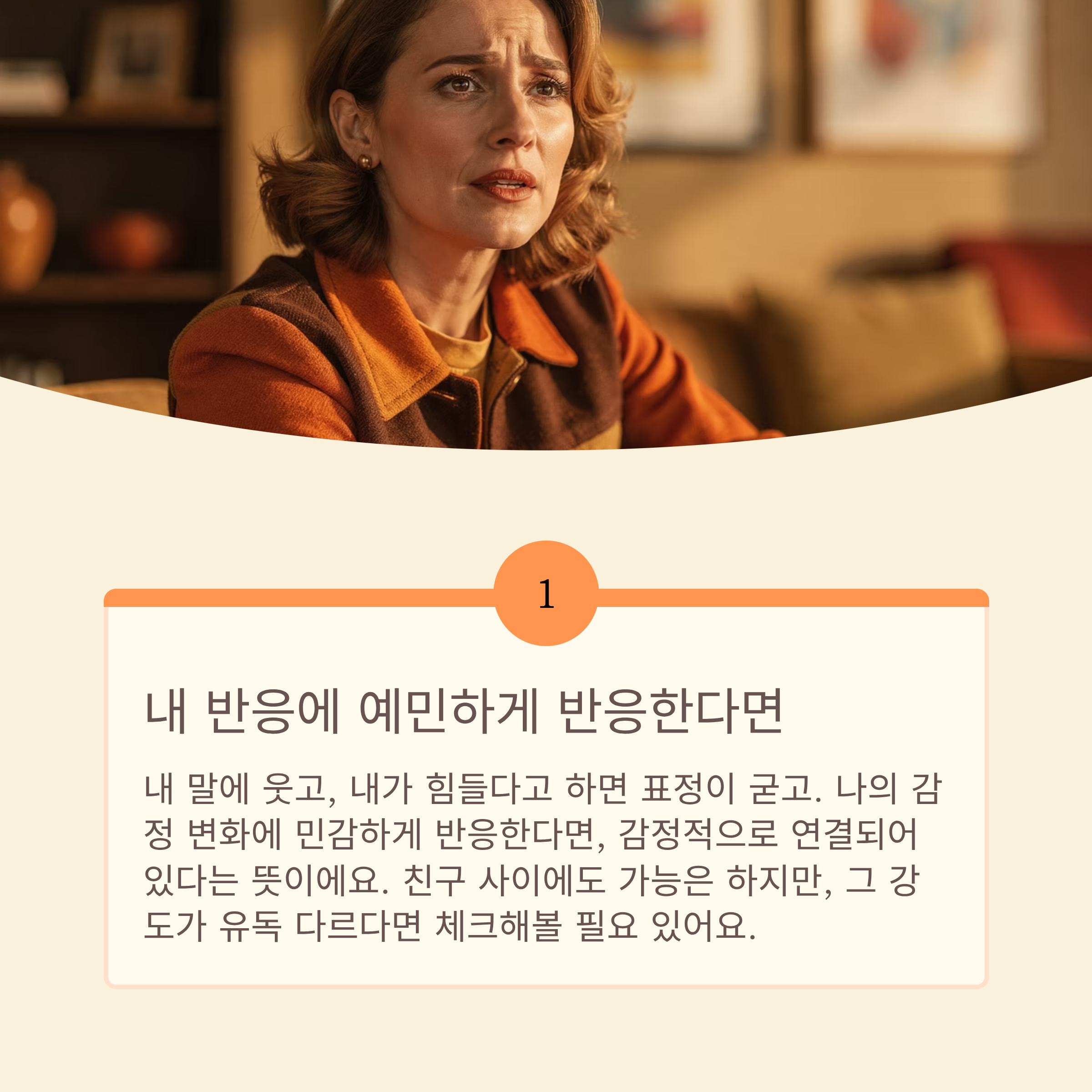 내 말에 웃고, 내가 힘들다고 하면 표정이 굳고. 나의 감정 변화에 민감하게 반응한다면, 감정적으로 연결되어 있다는 뜻이에요. 친구 사이에도 가능은 하지만, 그 강도가 유독 다르다면 체크해볼 필요 있어요.