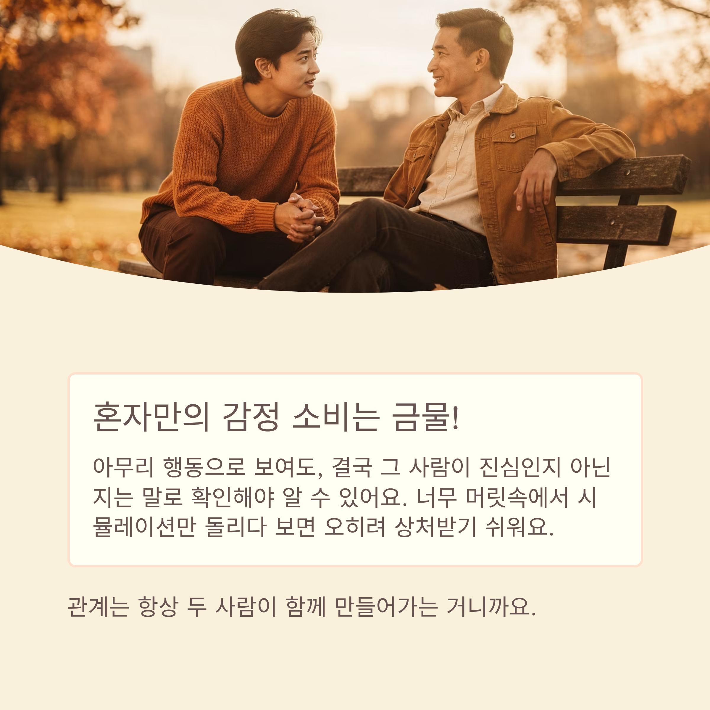 아무리 행동으로 보여도, 결국 그 사람이 진심인지 아닌지는 말로 확인해야 알 수 있어요. 너무 머릿속에서 시뮬레이션만 돌리다 보면 오히려 상처받기 쉬워요. 관계는 항상 두 사람이 함께 만들어가는 거니까요.