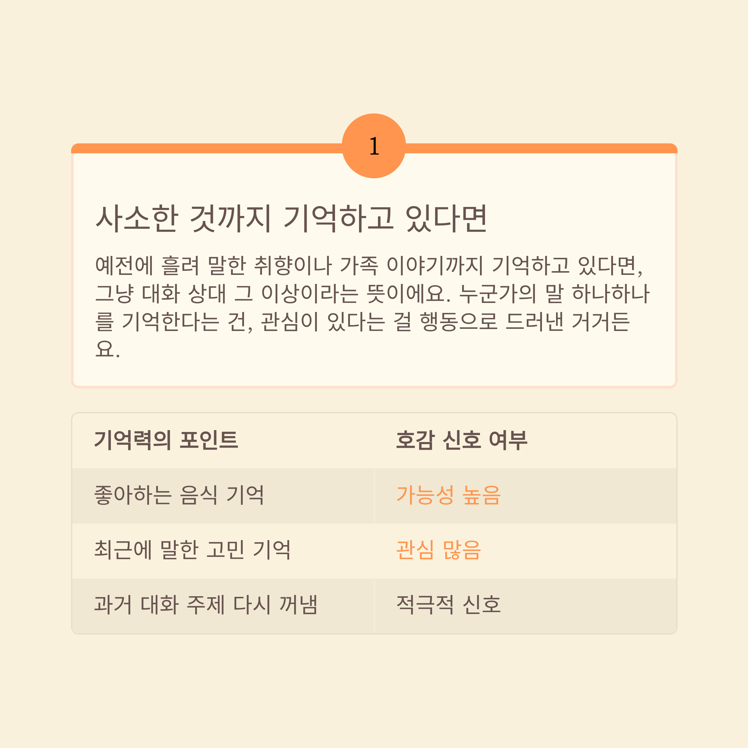 예전에 흘려 말한 취향이나 가족 이야기까지 기억하고 있다면, 그냥 대화 상대 그 이상이라는 뜻이에요. 누군가의 말 하나하나를 기억한다는 건, 관심이 있다는 걸 행동으로 드러낸 거거든요.