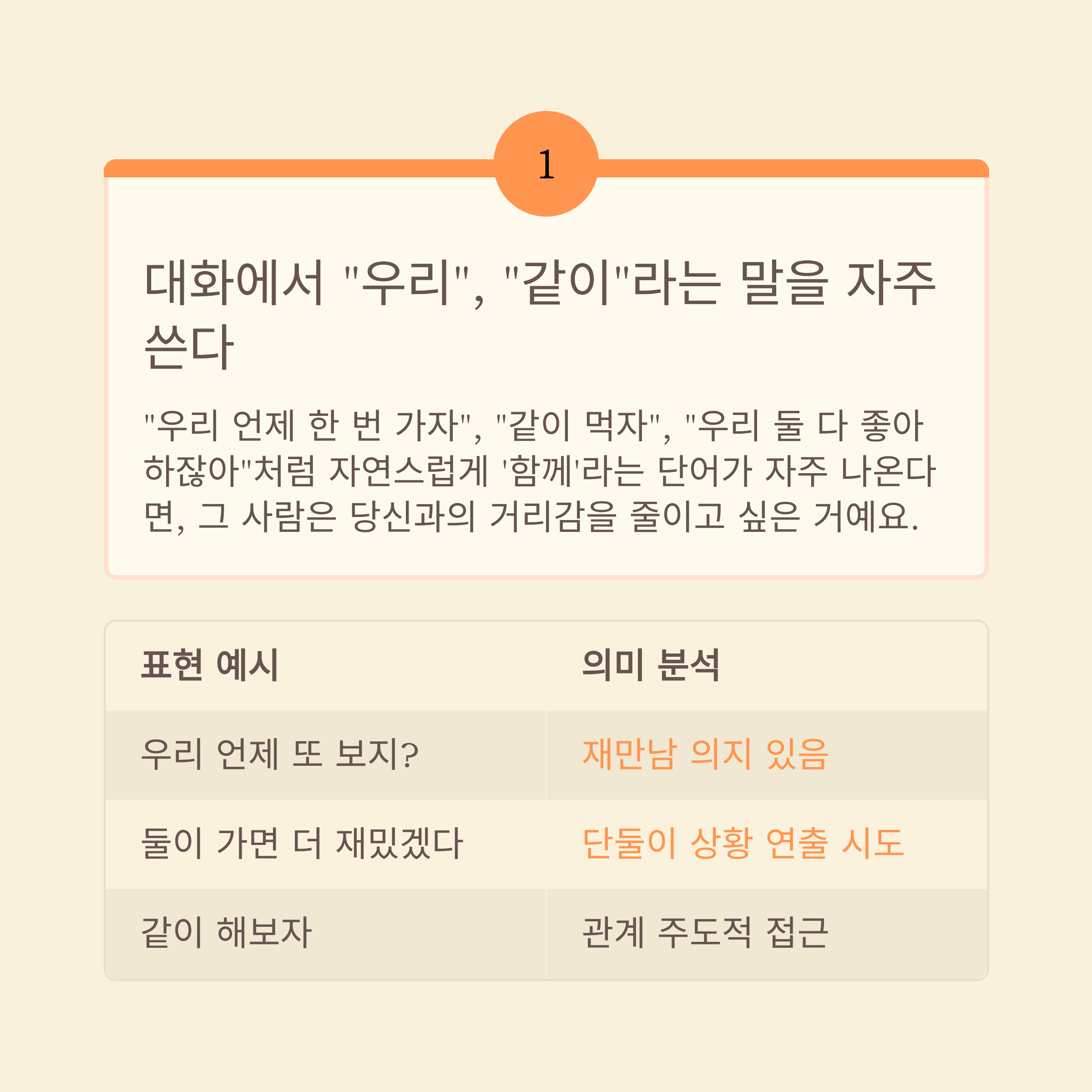 “우리 언제 한 번 가자”, “같이 먹자”, “우리 둘 다 좋아하잖아”처럼 자연스럽게 '함께'라는 단어가 자주 나온다면, 그 사람은 당신과의 거리감을 줄이고 싶은 거예요.