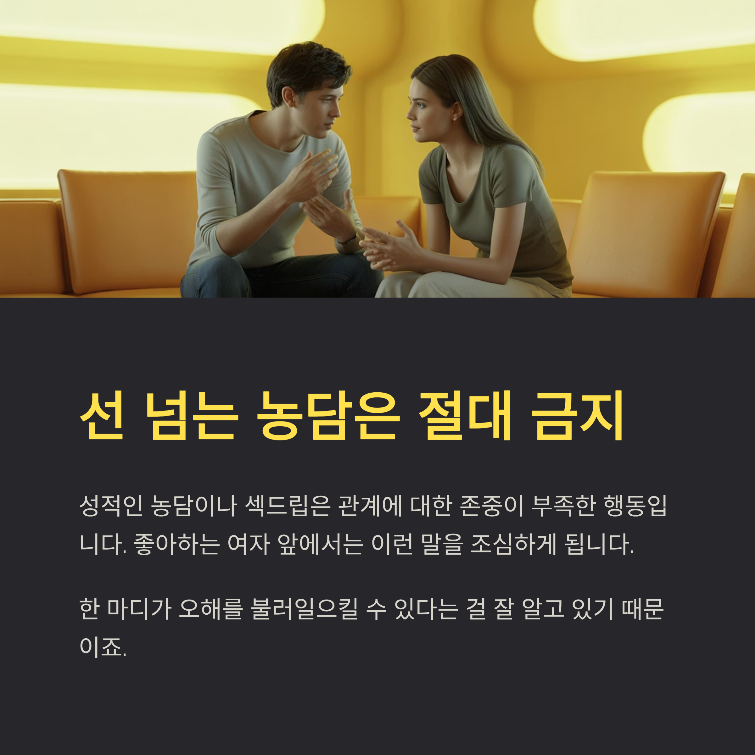 남자가 성적인 농담이나 이른바 ‘섹드립’을 꺼내는 건 그 관계에 대한 기본적인 존중이 부족할 가능성이 큽니다.