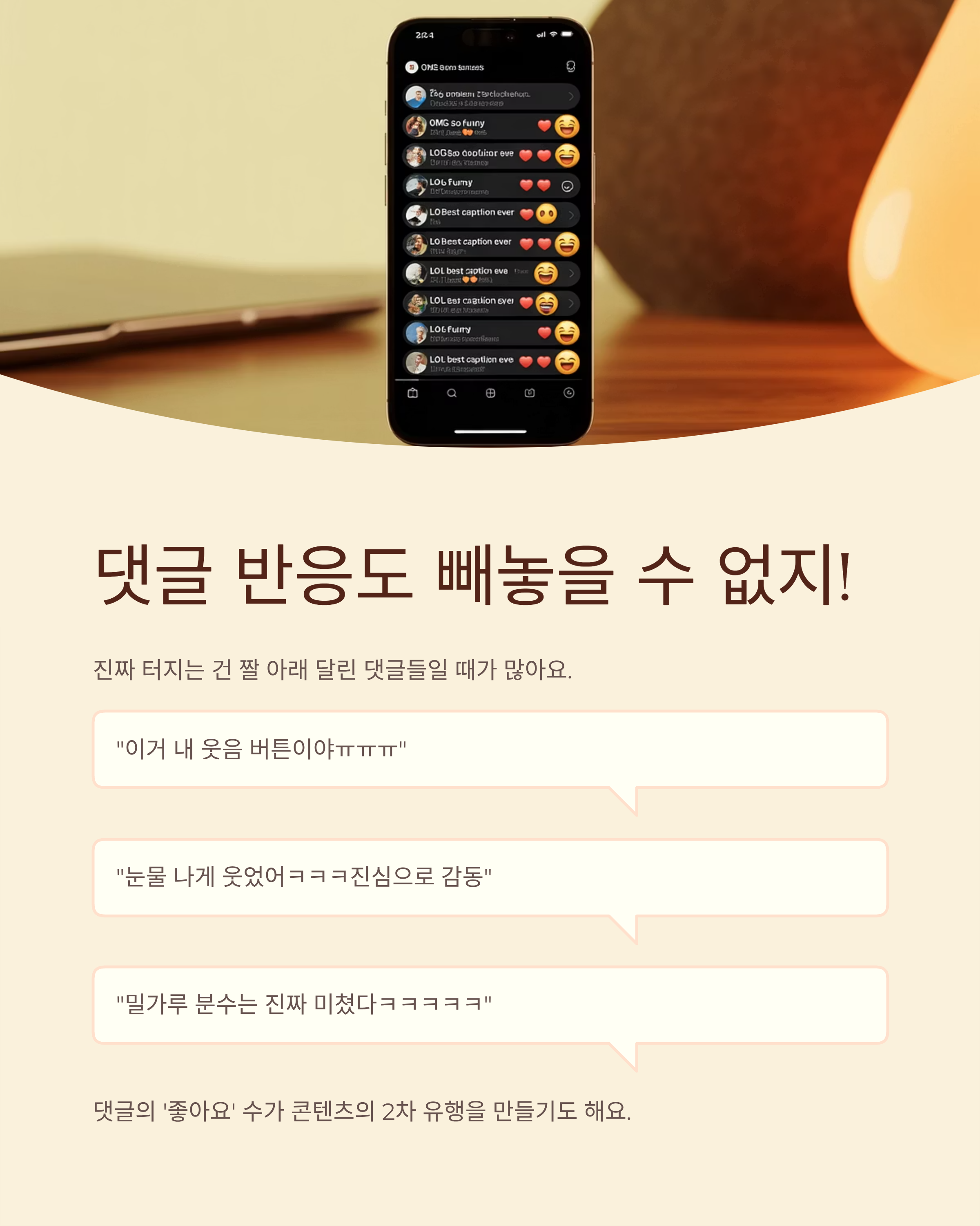 이런 식으로 댓글이 또 다른 재미의 원천이 되고 있죠. 그리고 이런 댓글에 달린 ‘좋아요’ 수는 콘텐츠의 2차 유행을 만들기도 해요.