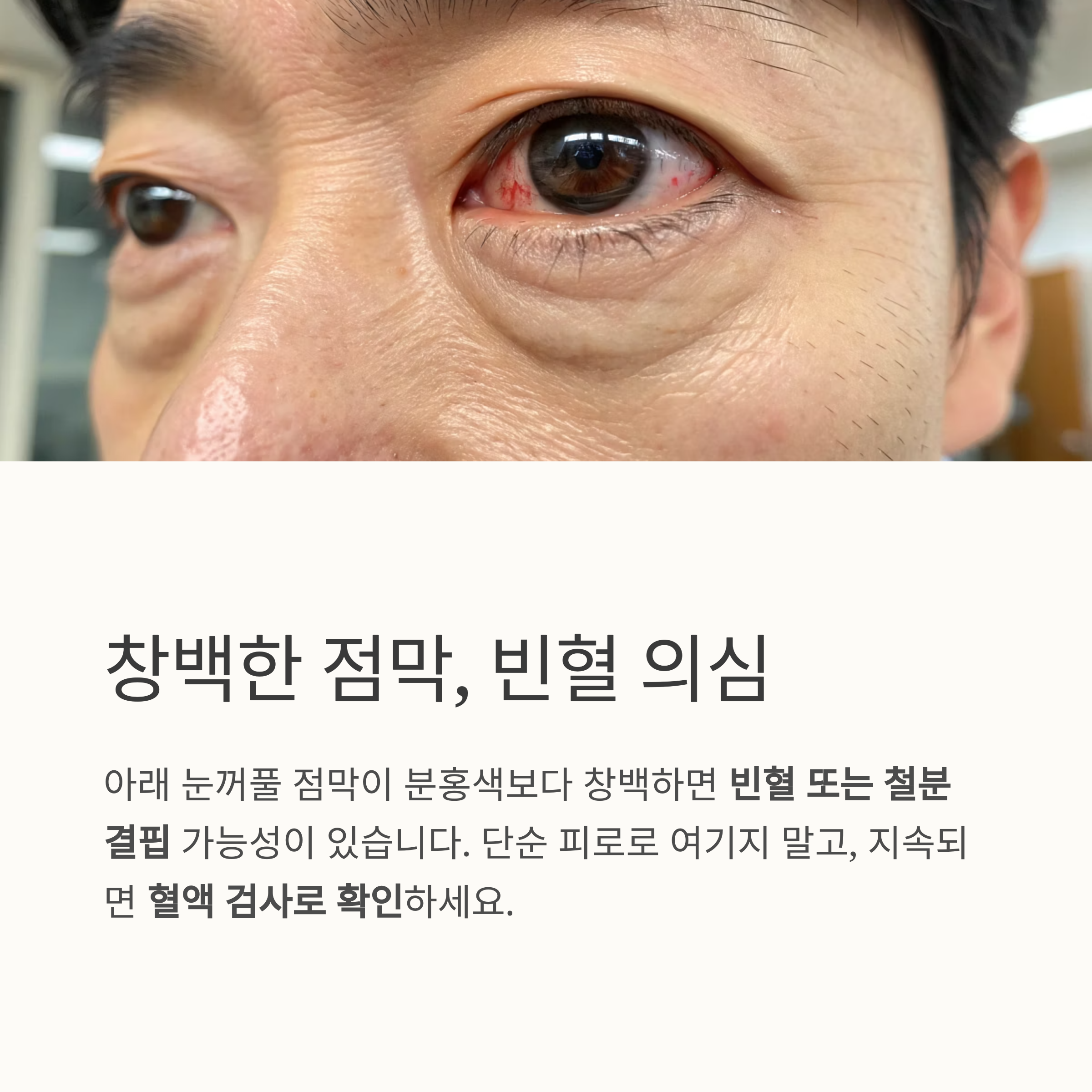 아래 눈꺼풀을 뒤집었을 때 점막이 분홍색보다 창백하면 빈혈 또는 철분 결핍 가능성이 있습니다.