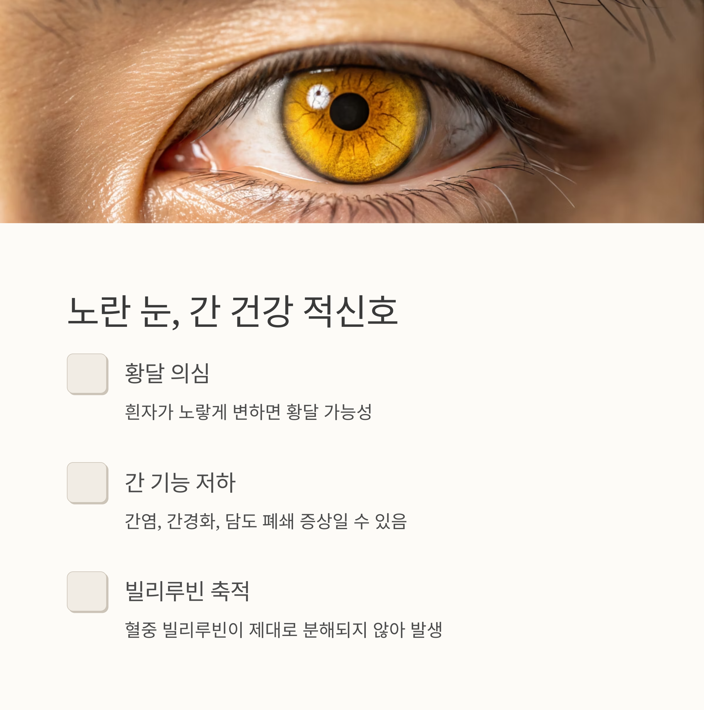 이는 혈중 빌리루빈이 제대로 분해되지 않아 공막에 쌓이면서 눈 색깔을 노랗게 만듭니다.