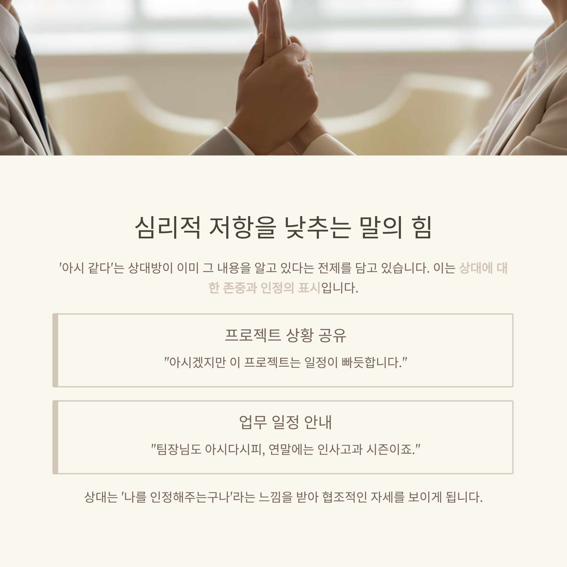 이는 단순한 말이 아니라 상대에 대한 존중과 인정의 표시이기 때문에, 심리적 저항을 자동으로 낮춰줍니다.