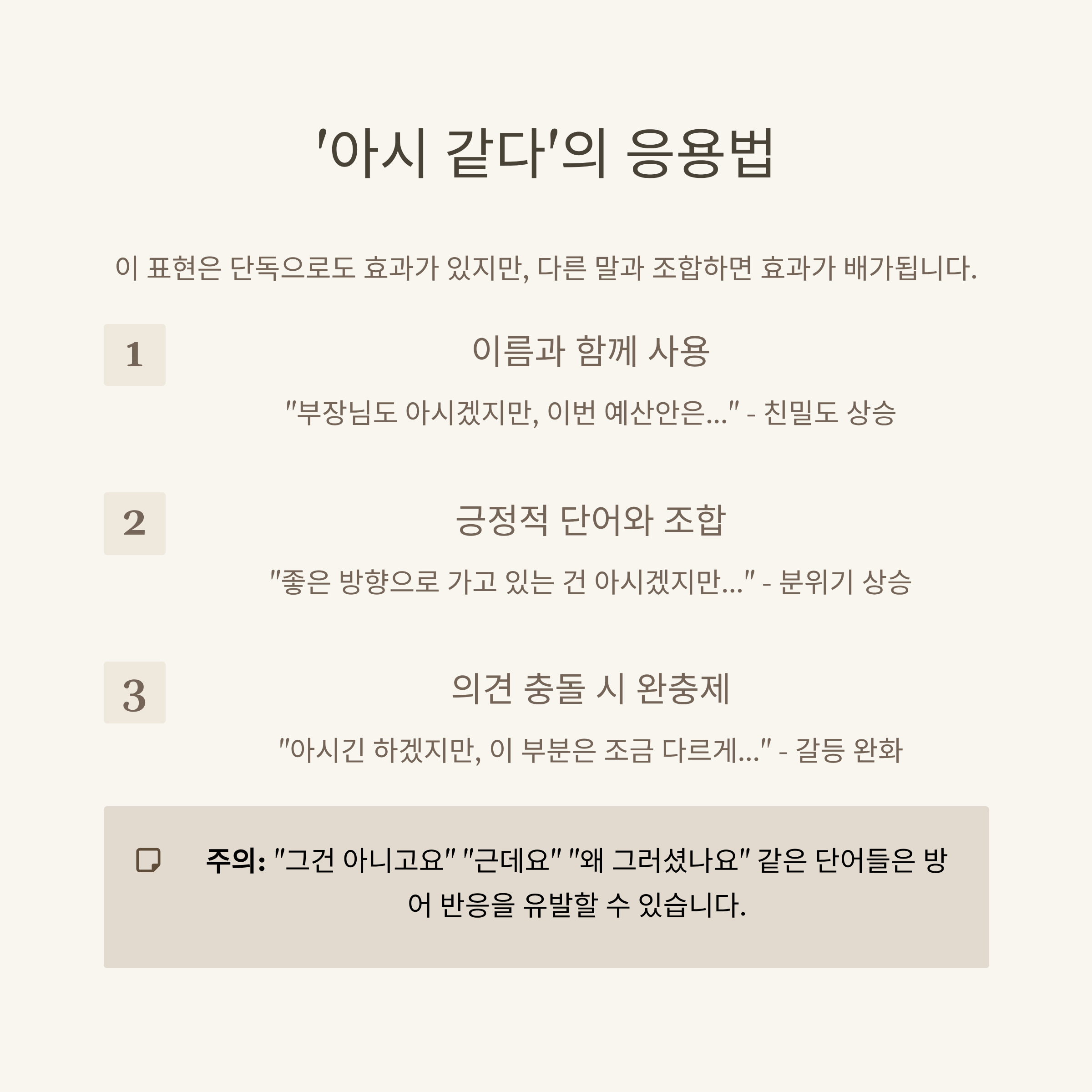 예: “좋은 방향으로 가고 있는 건 아시겠지만, 여기 한 가지만 조정해볼까요?” - 의견 충돌 시 완충제 역할
