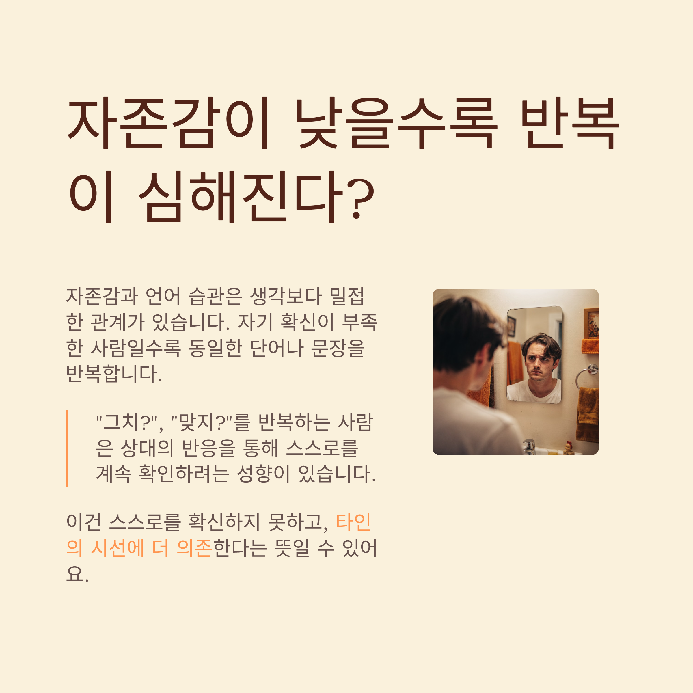 자기 확신이 부족한 사람일수록, 자신의 말에 힘을 실기기 위해 동일한 단어나 문장을 반복하는 경우가 많아요. 특히 질문 끝에 "그치?", "맞지?"를 반복하는 사람은 상대의 반응을 통해 스스로를 계속 확인하려는 성향이 있습니다.