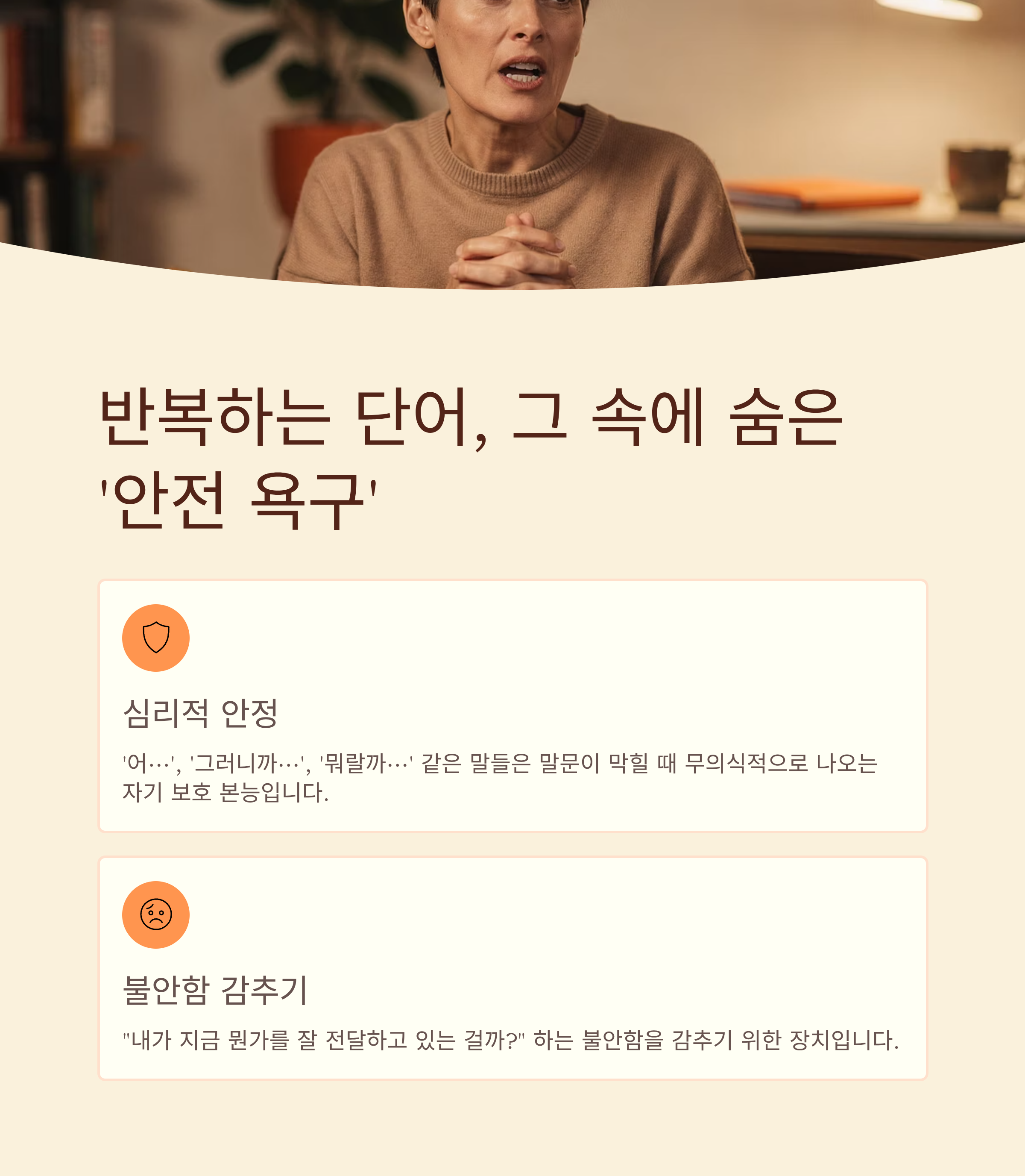 ‘어’, ‘그러니까’, ‘뭐랄까’ 같은 말들은 말문이 막힐 때 무의식적으로 나오는 말들이에요. 이건 상대에게 무언가를 확신 있게 전달하기보다는, 말을 이어가고 싶은 자기 보호 본능에 가까워요.