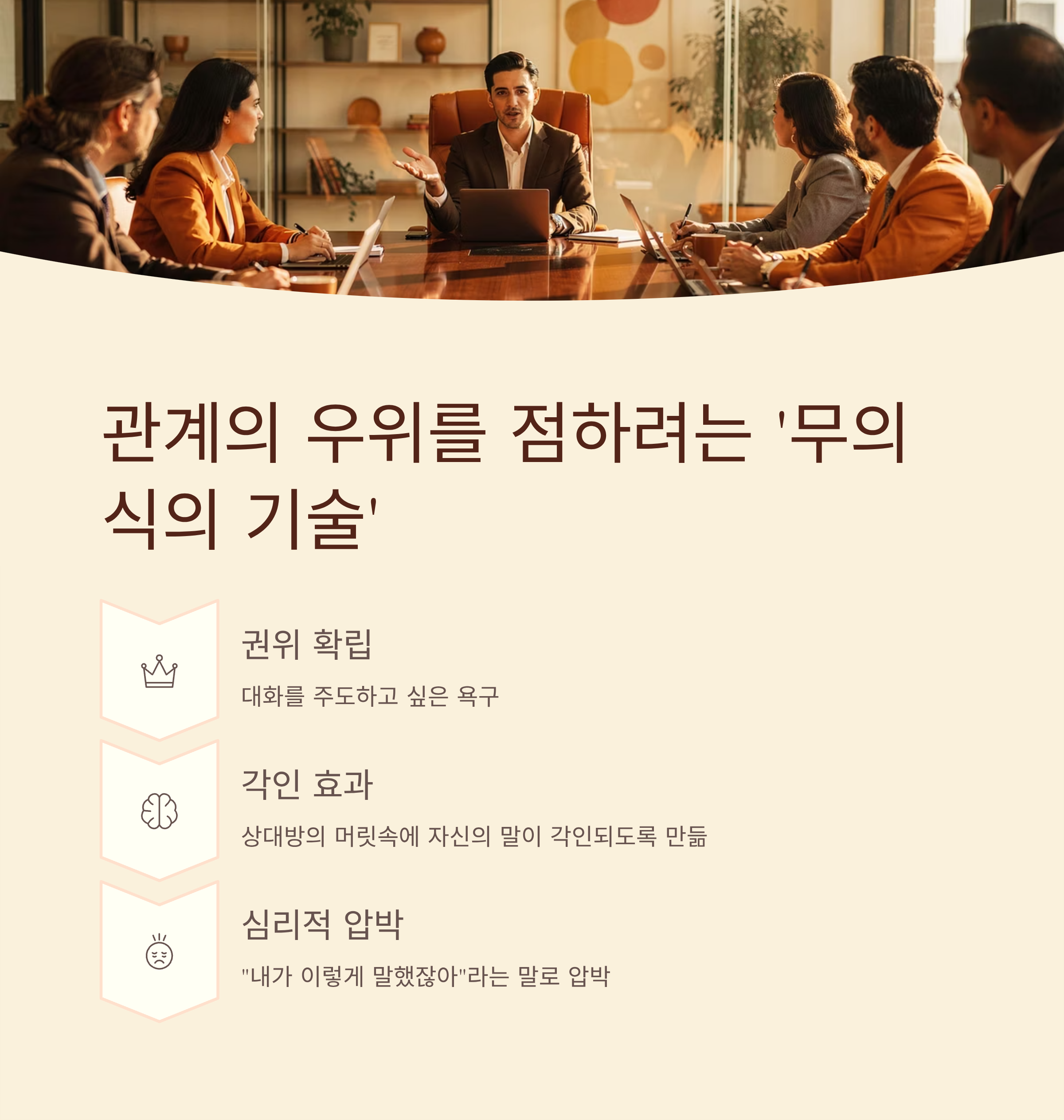이런 경우는 “내가 이렇게 말했잖아”라는 말이 자주 등장하며, 반복은 일종의 심리적 압박으로 작용할 수 있죠.