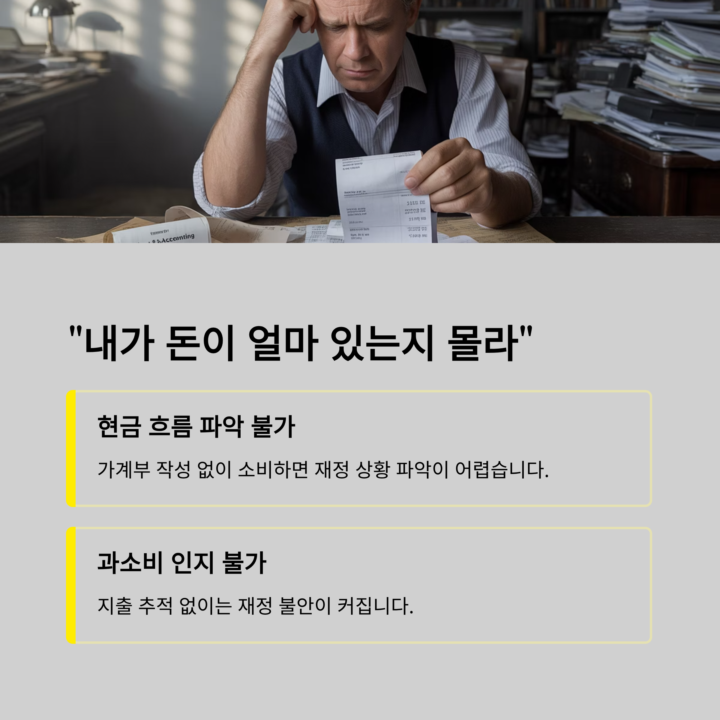 가계부 작성 없이 소비하는 습관은 재정 상황 파악을 어렵게 합니다.
