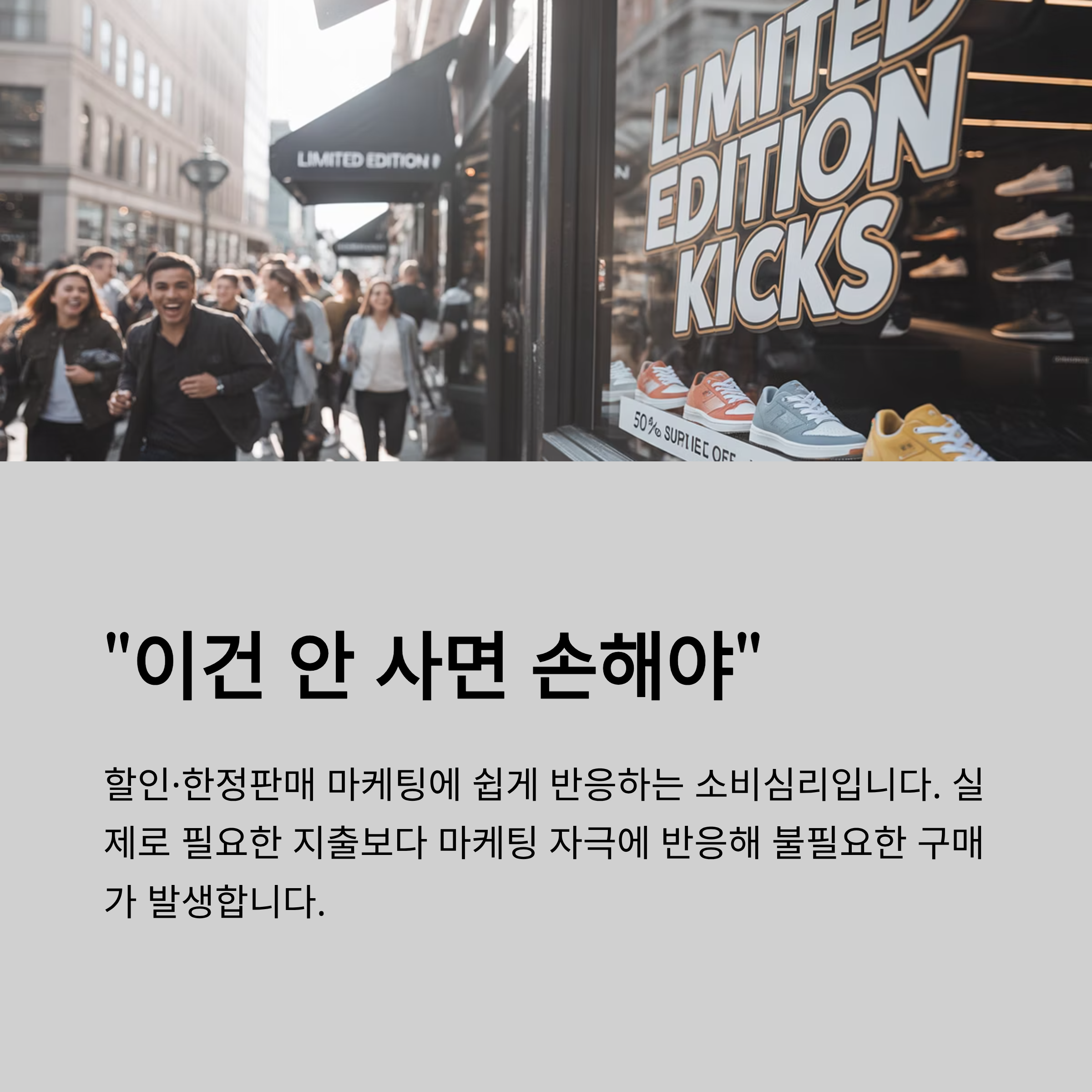 할인·한정판매 마케팅에 쉽게 반응하는 소비심리입니다.