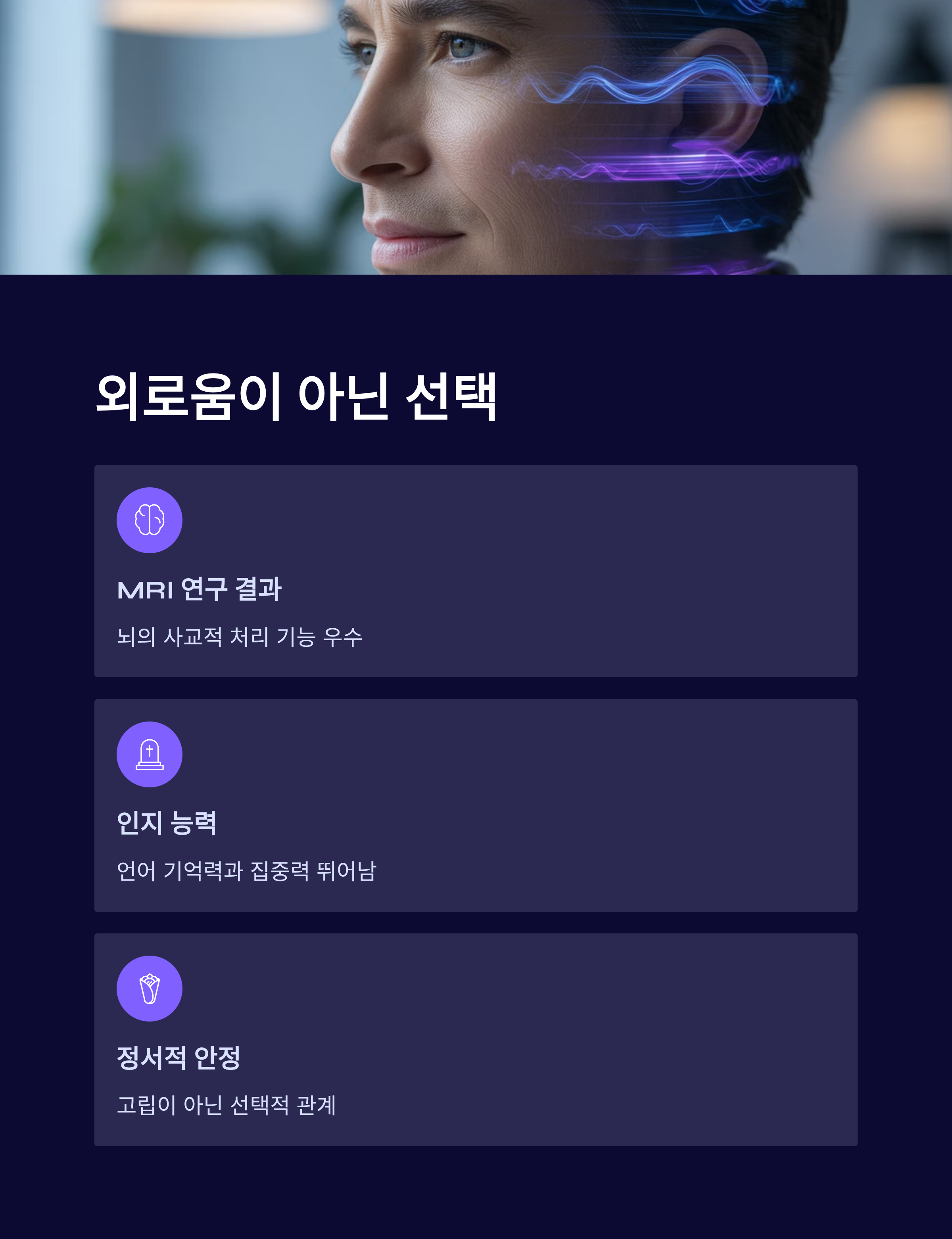 소수의 깊은 관계를 맺는 사람의 경우, 뇌의 사교적 처리 기능과 언어 기억력, 장기 집중력에서 우수한 활동 패턴이 확인되었으며, 오히려 '고립'이 아니라 '선택적 관계'라는 점에서 정서적으로 안정된 상태라는 결론이 나왔습니다.