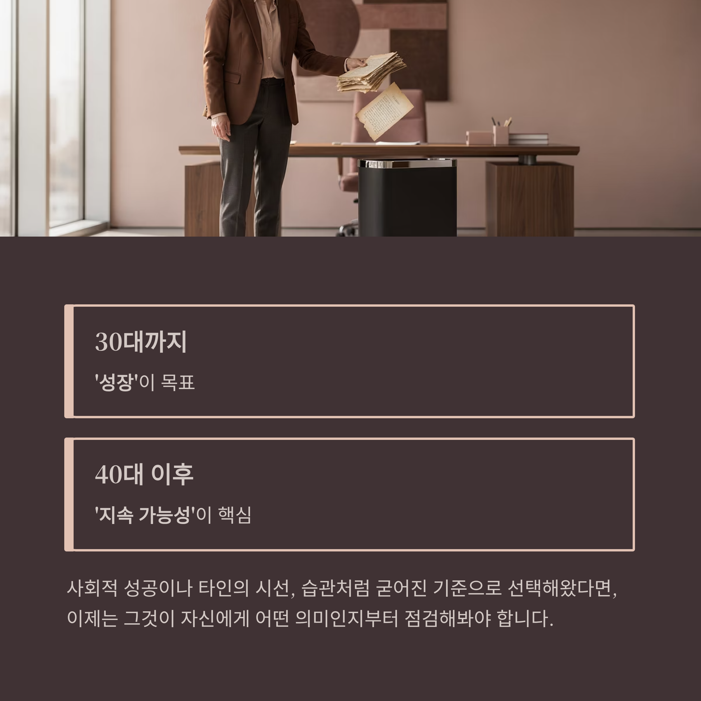 지금까지 사회적 성공이나 타인의 시선, 혹은 습관처럼 굳어진 기준으로 선택해왔다면, 이제는 그것이 자신에게 어떤 의미인지부터 점검해봐야 합니다.