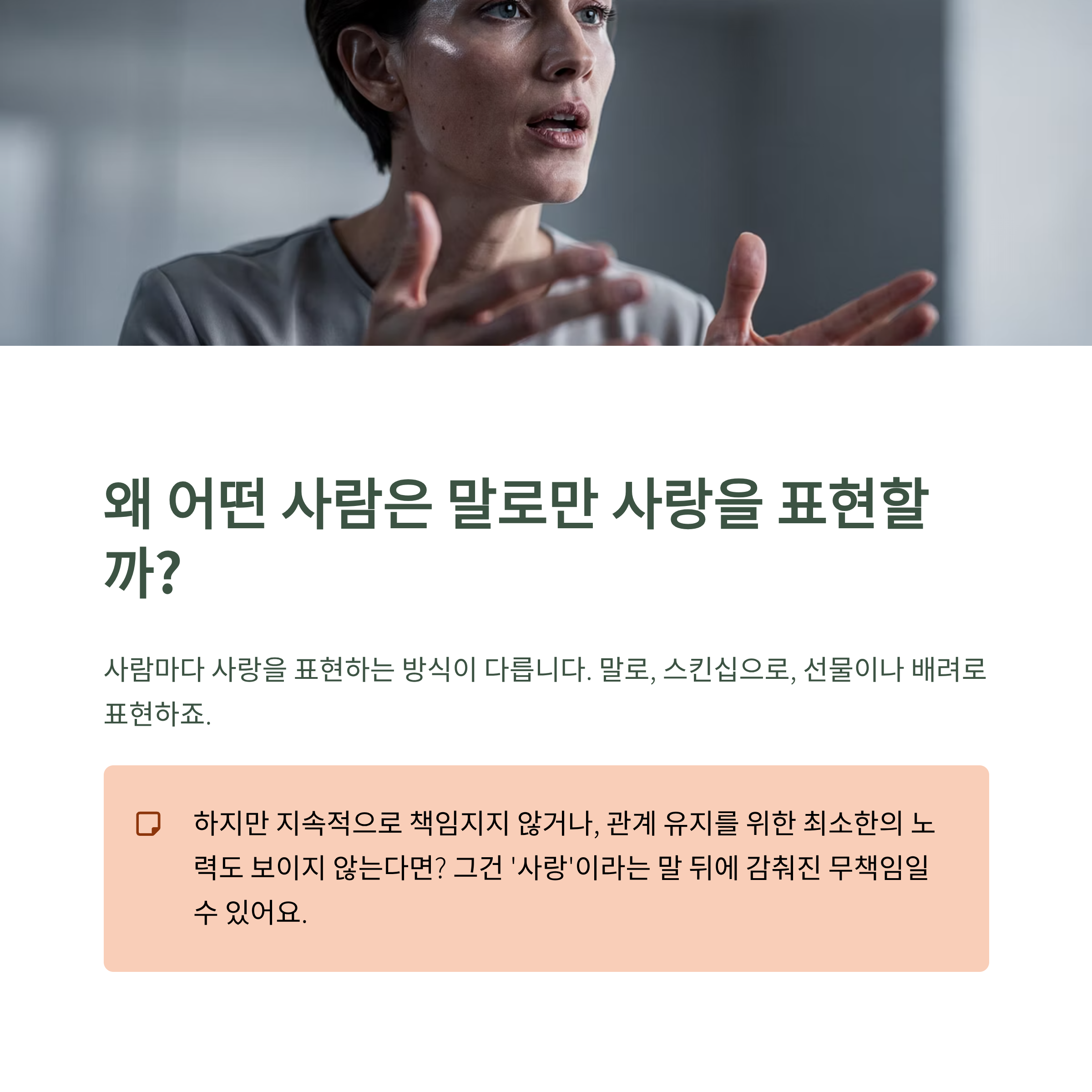 "사랑해"라는 말은 달콤하지만, 그 말이 행동으로 이어지지 않을 때 우리는 혼란을 느끼곤 하죠.