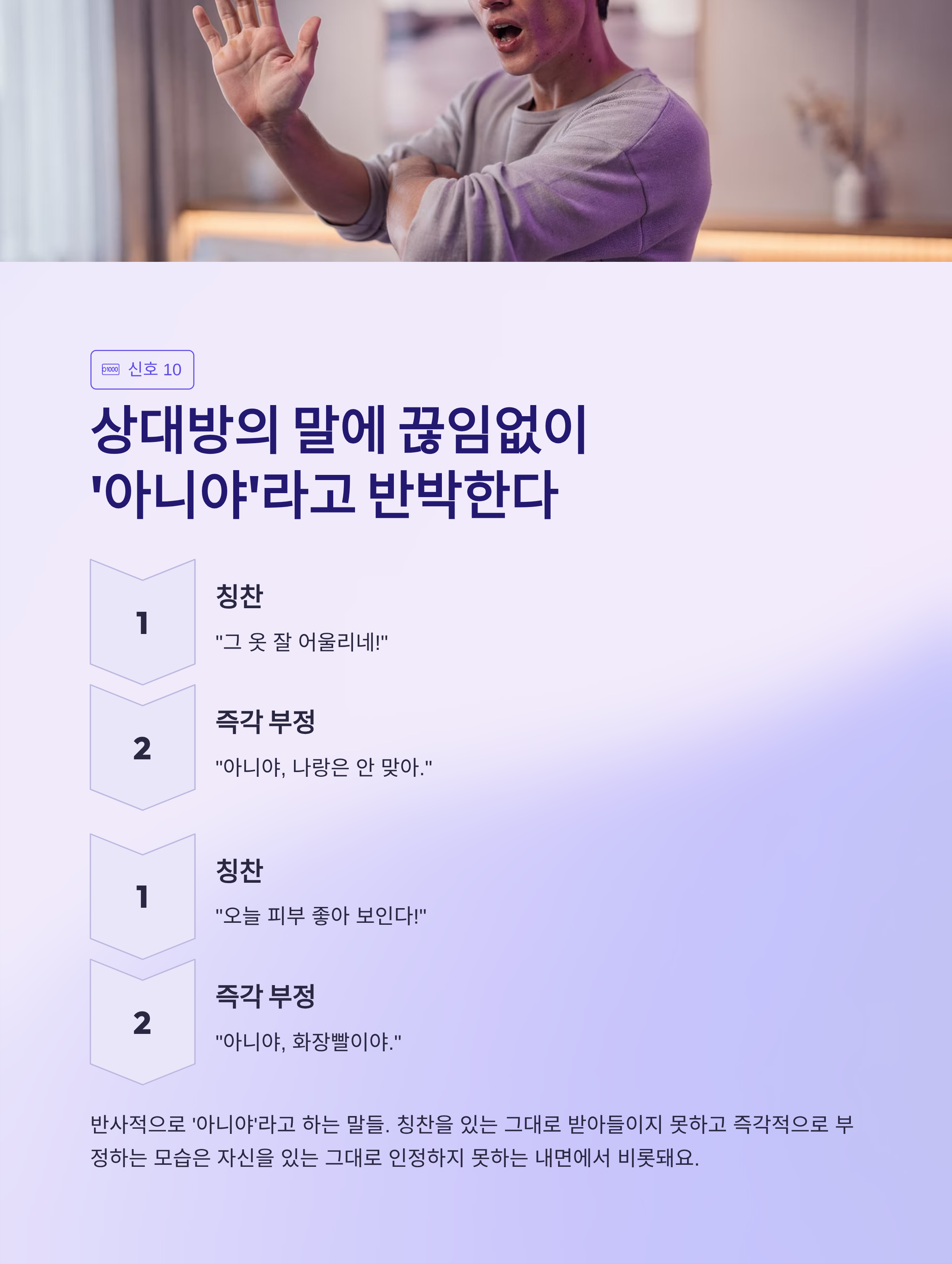 칭찬을 있는 그대로 받아들이지 못하고 즉각적으로 부정하는 모습은
