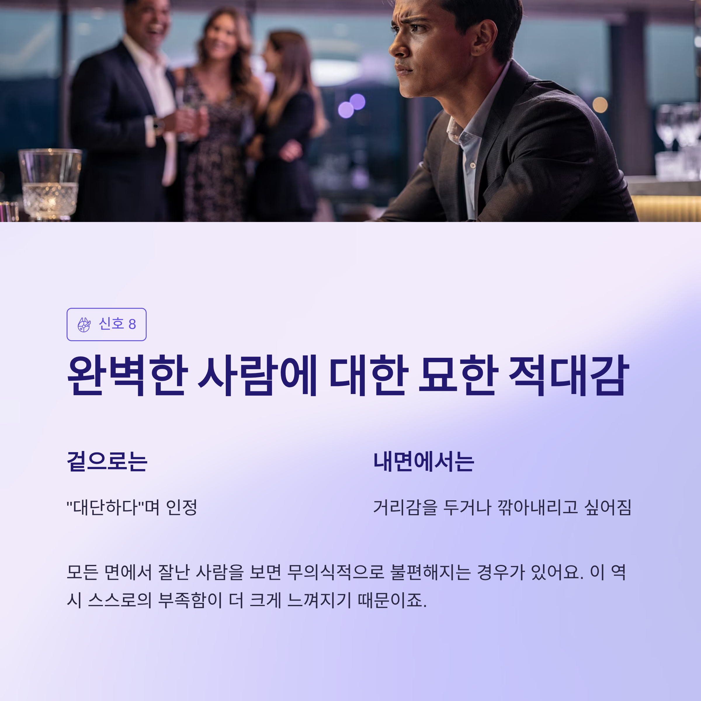 겉으로는 "대단하다"며 인정하지만, 내면에서는 거리감을 두거나 깎아내리고 싶어져요.