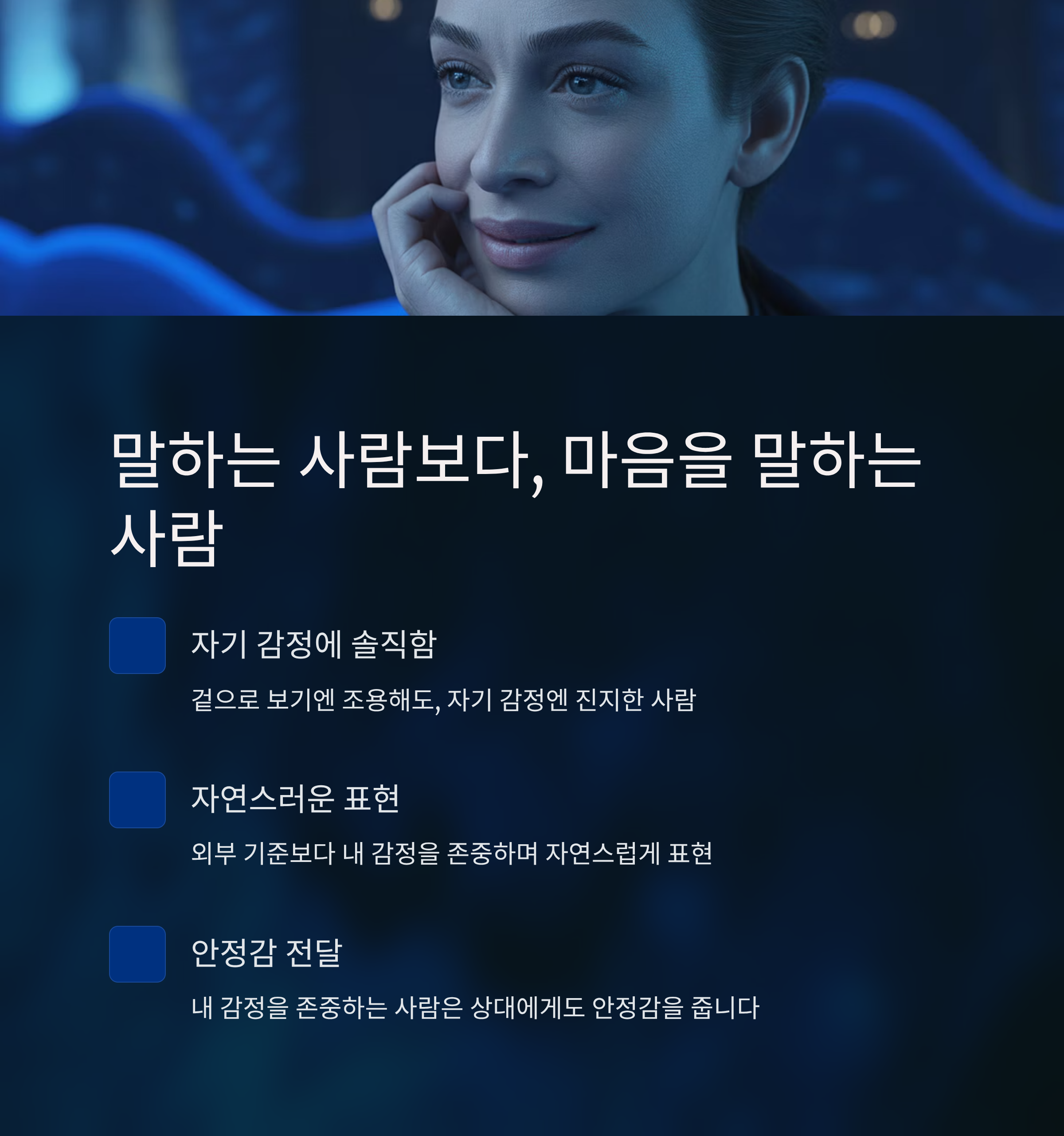 겉으로 보기엔 조용해도, 자기 감정엔 솔직한 사람이 있습니다. 사랑받는 여성은 외부의 기준에 맞추기보다 자기 감정을 진지하게 바라보며, 자연스럽게 표현할 줄 압니다. 내 감정을 스스로 존중할 줄 아는 사람은 상대에게도 안정감을 주게 마련이니까요.
