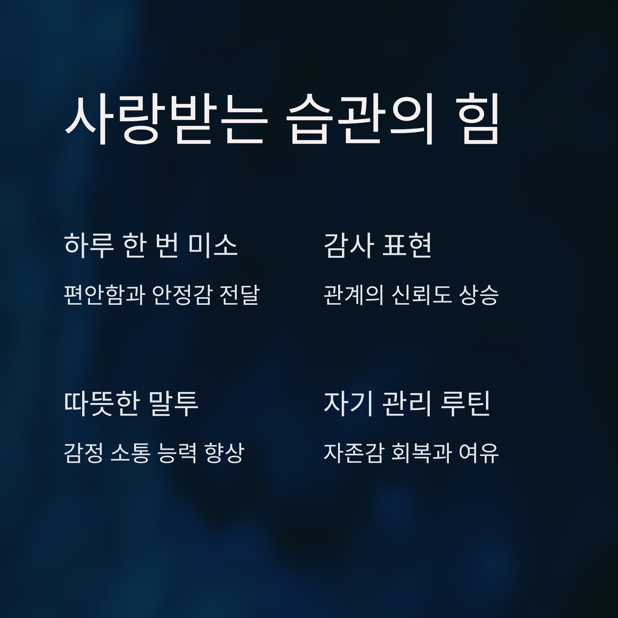 사랑받는 사람의 모습은 화려하지 않습니다. 오히려 소소한 일상에서 매일 반복하는 작지만 강력한 표현에서 비롯됩니다. 매일 하루에 한 번, 따뜻한 미소와 진심 어린 감사의 말 한마디. 이 단순한 습관이 연인, 친구, 가족 등 주변 모든 사람과의 관계를 부드럽고 따뜻하게 만들어줍니다. 사랑은 거창한 고백이 아니라, 매일의 '감사'와 '긍정'에서 시작됩니다.