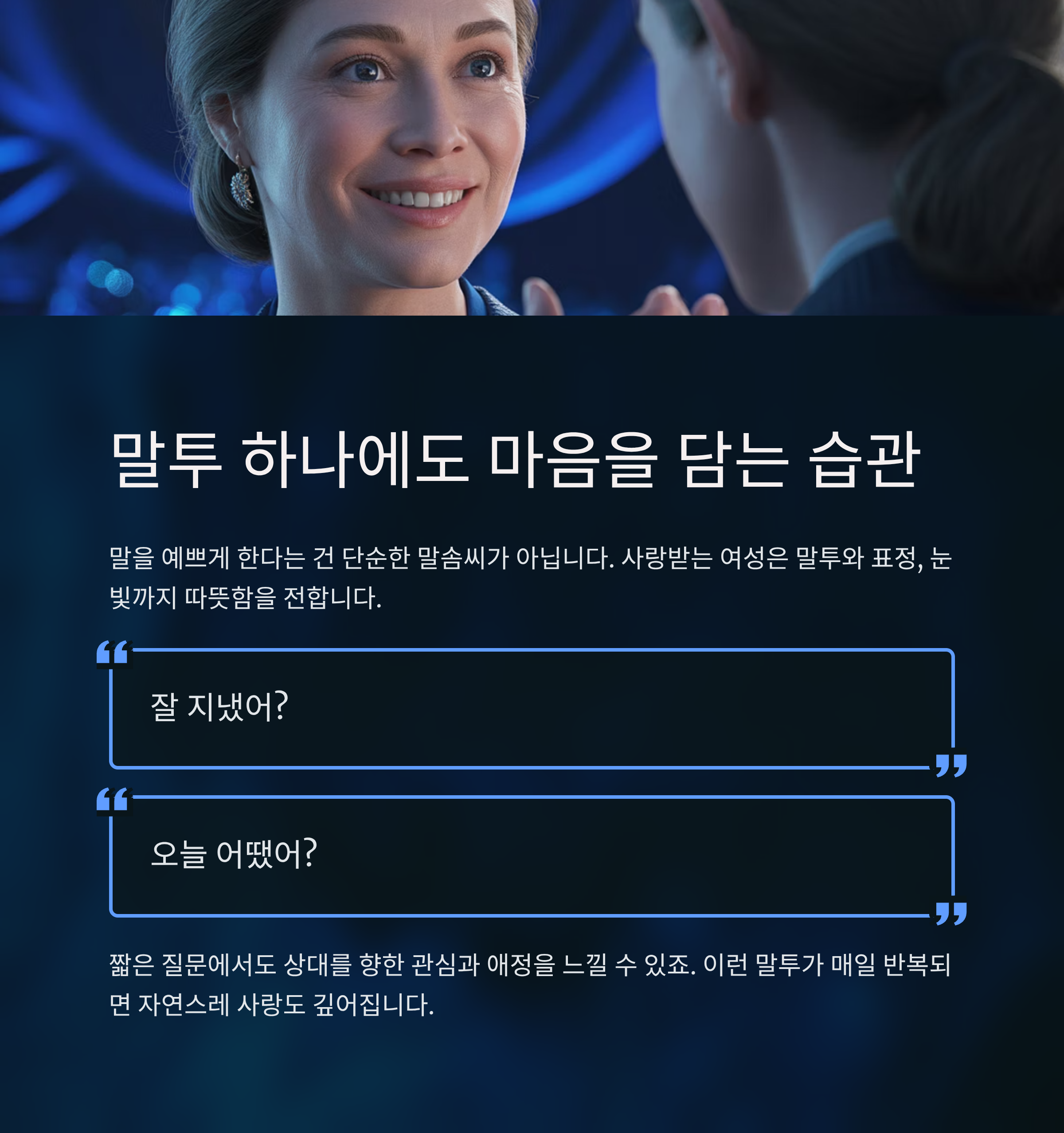 말을 예쁘게 한다는 건 단순한 말솜씨가 아닙니다. 사랑받는 여성은 말투와 표정, 눈빛까지 따뜻함을 전합니다. “잘 지냈어?”, “오늘 어땠어?”라는 짧은 질문에서도 상대를 향한 관심과 애정을 느낄 수 있죠. 이런 말투가 매일 반복되면 자연스레 사랑도 깊어집니다.