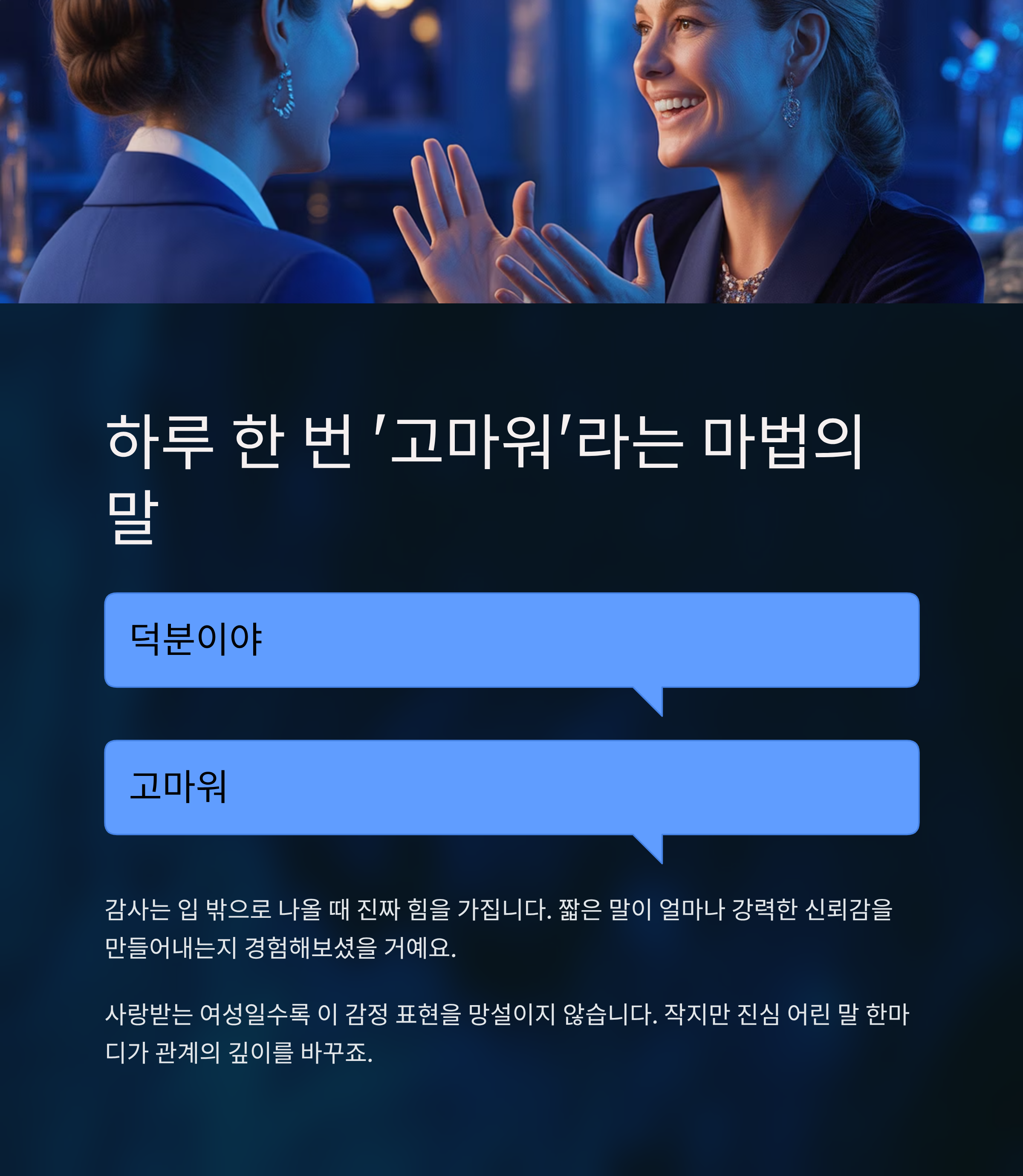 감사는 입 밖으로 나올 때 진짜 힘을 가집니다. “덕분이야”, “고마워”라는 짧은 말이 얼마나 강력한 신뢰감을 만들어내는지 경험해보셨을 거예요. 사랑받는 여성일수록 이 감정 표현을 망설이지 않습니다. 작지만 진심 어린 말 한마디가 관계의 깊이를 바꾸죠.