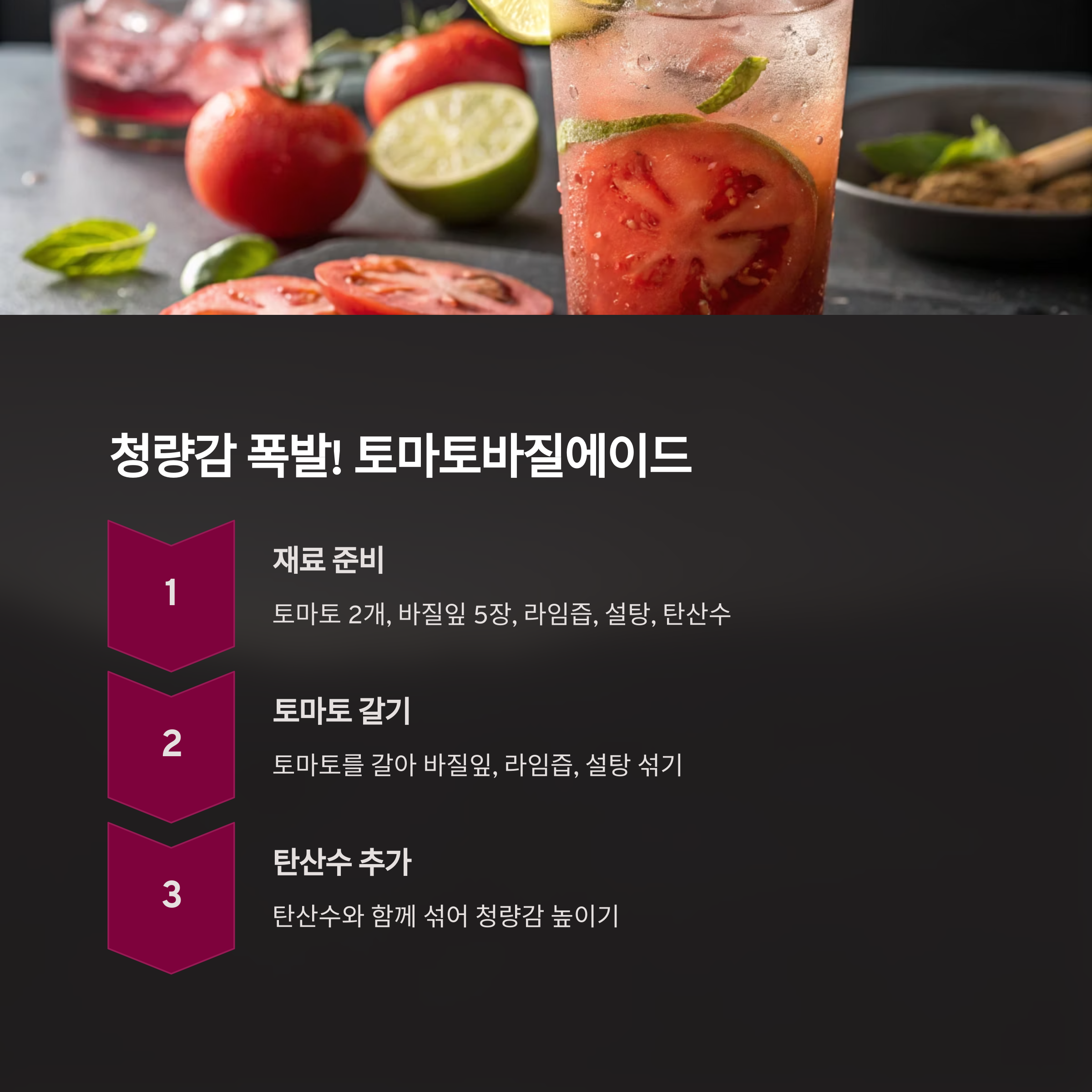 토마토바질에이드 2인분 토마토 2개, 바질잎 5장, 탄산수 500ml 15분 초급