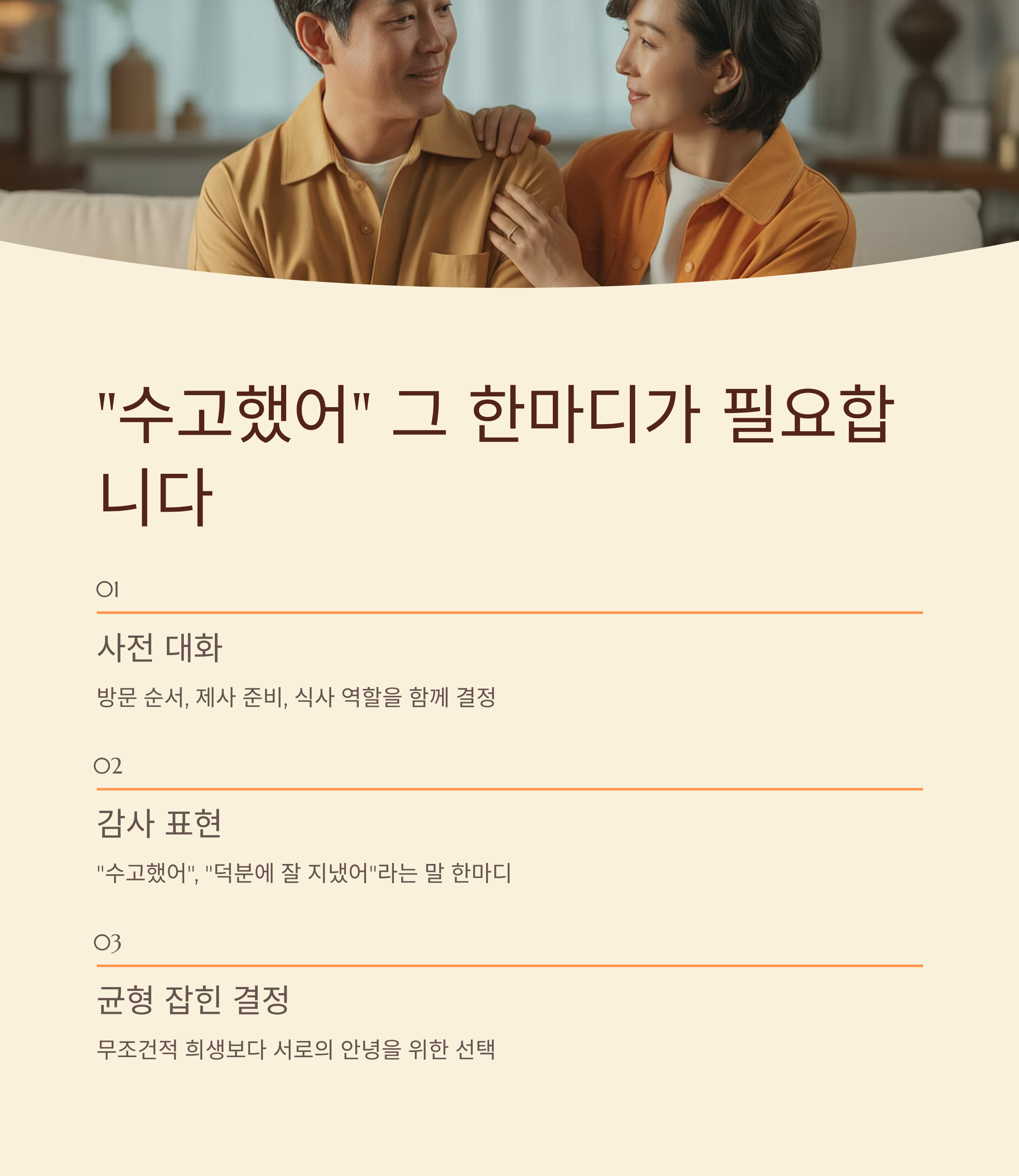 방문 순서, 제사 준비, 식사 자리에서의 역할 등 모든 요소를 함께 결정해야 부부 사이에 균형이 생깁니다. "수고했어", "덕분에 잘 지냈어"라는 말 한마디가 긴장된 마음을 녹이고, 신뢰를 회복하는 첫걸음이 됩니다.