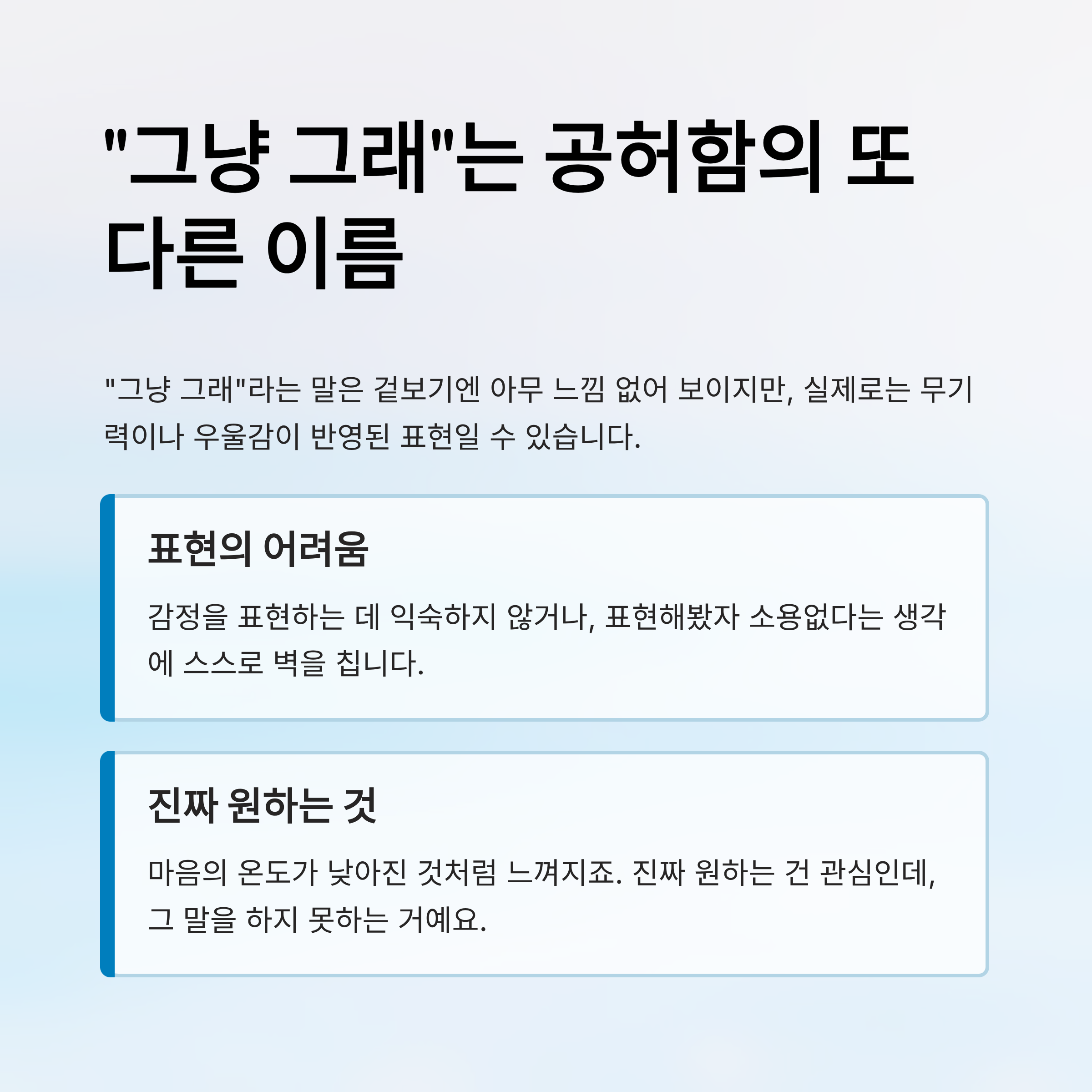 사람들은 종종 감정을 들키지 않기 위해 같은 말을 반복합니다. "괜찮아", "아무렇지 않아", "그냥 그래" 같은 말들이 대표적이죠. 무심한 말투에 익숙해질수록 그 안에 숨겨진 감정의 무게는 더 깊어질 수 있습니다. 이번 글에서는 반복되는 무표정한 말들 속에 숨겨진 진짜 의미와, 그것을 어떻게 읽어야 하는지에 대해 이야기해보겠습니다.