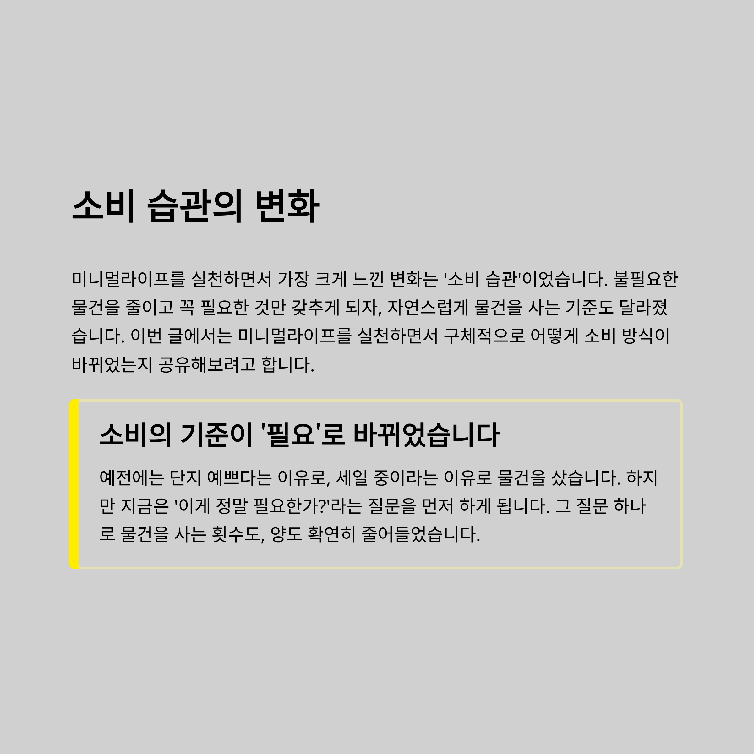 이번 글에서는 미니멀라이프를 실천하면서 구체적으로 어떻게 소비 방식이 바뀌었는지 공유해보려고 합니다.