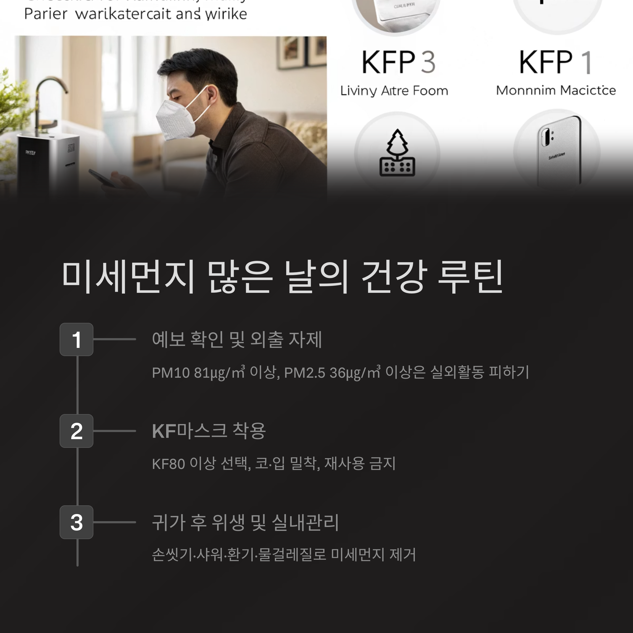 | 귀가 후 위생 및 실내관리 | 손씻기·샤워·환기·물걸레질로 미세먼지 제거 |