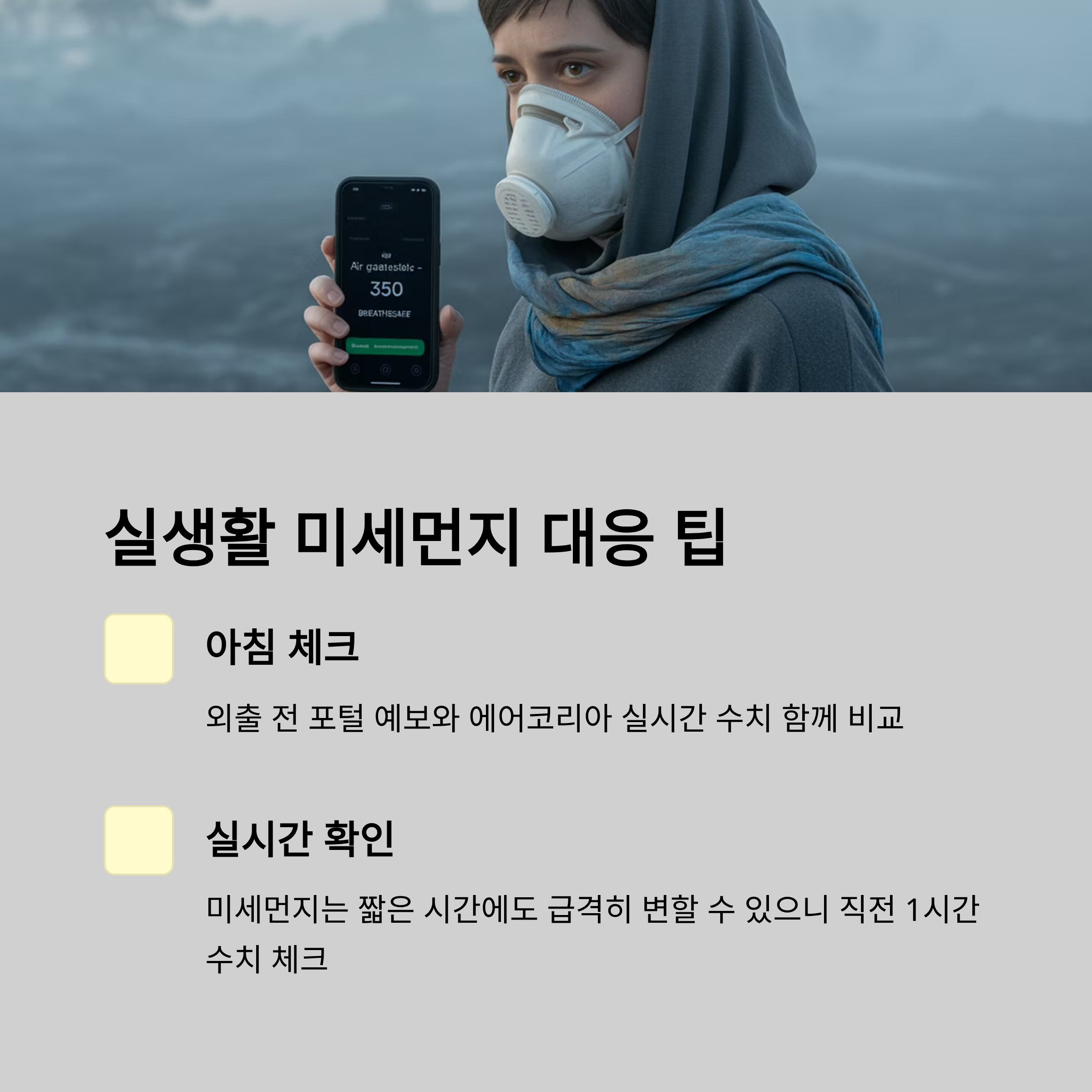 아침에 외출 전, 포털의 예보와 에어코리아의 실시간 수치를 함께 비교하세요.
