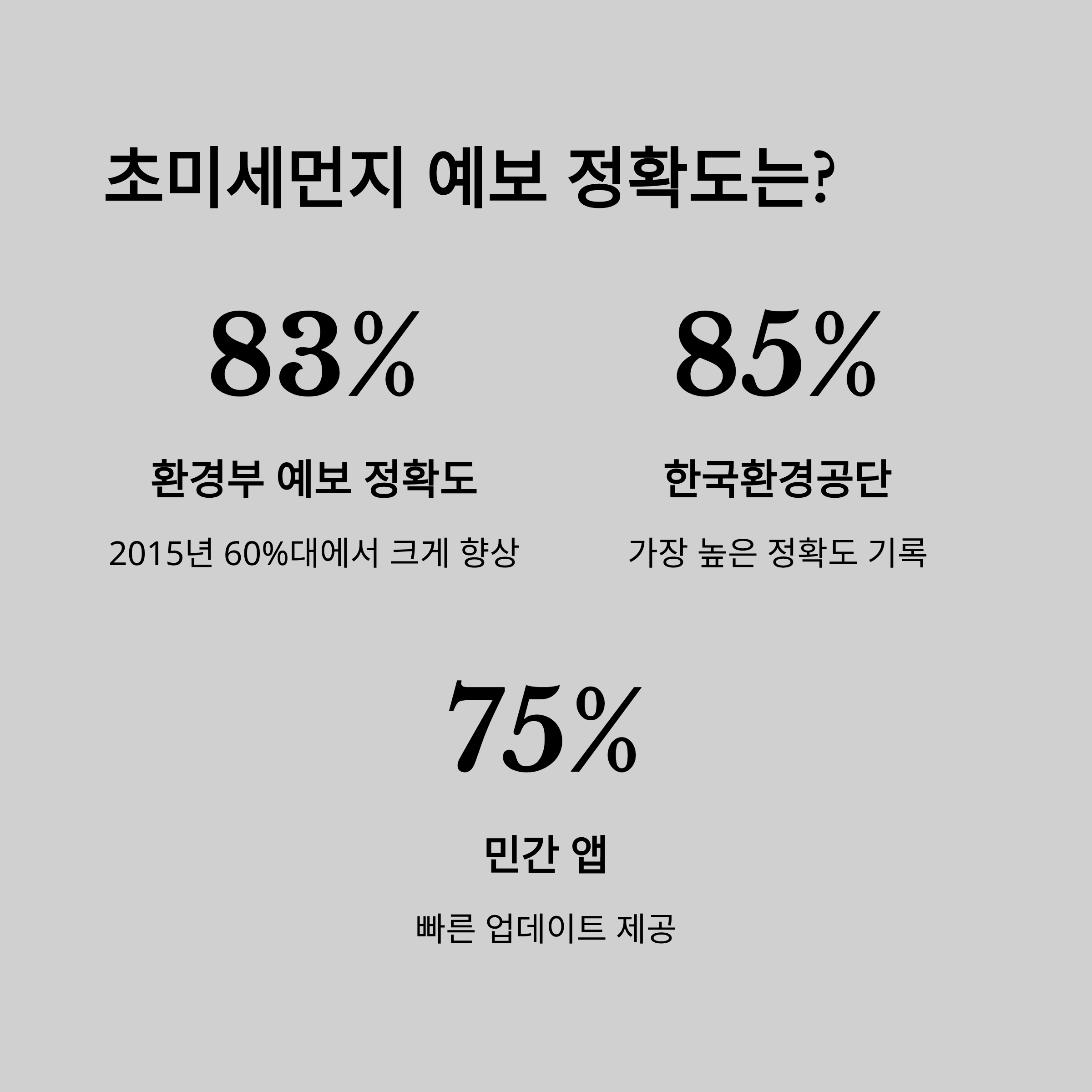 2024년 기준 환경부 발표에 따르면 초미세먼지 예보 정확도는 약 83%에 달한다고 합니다.