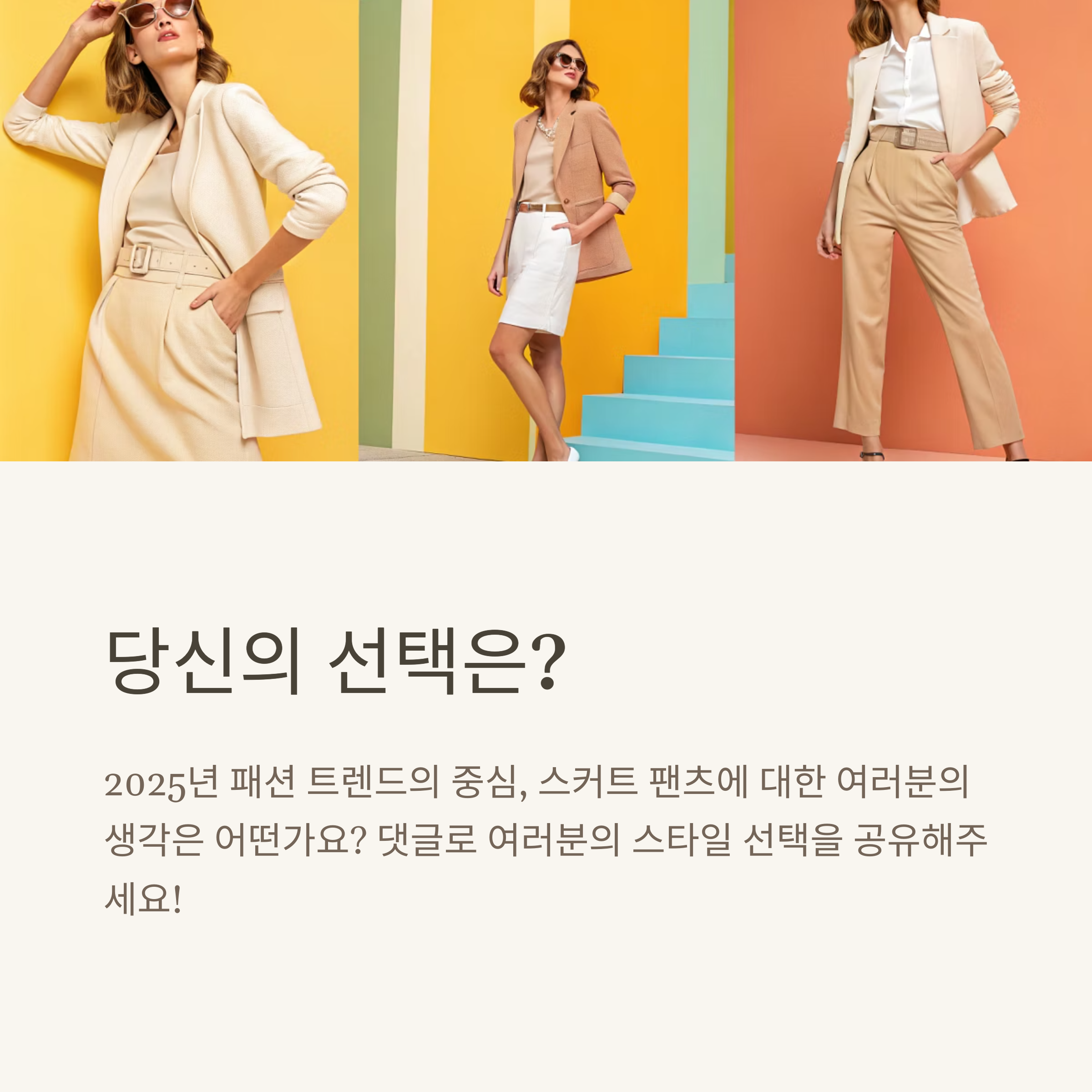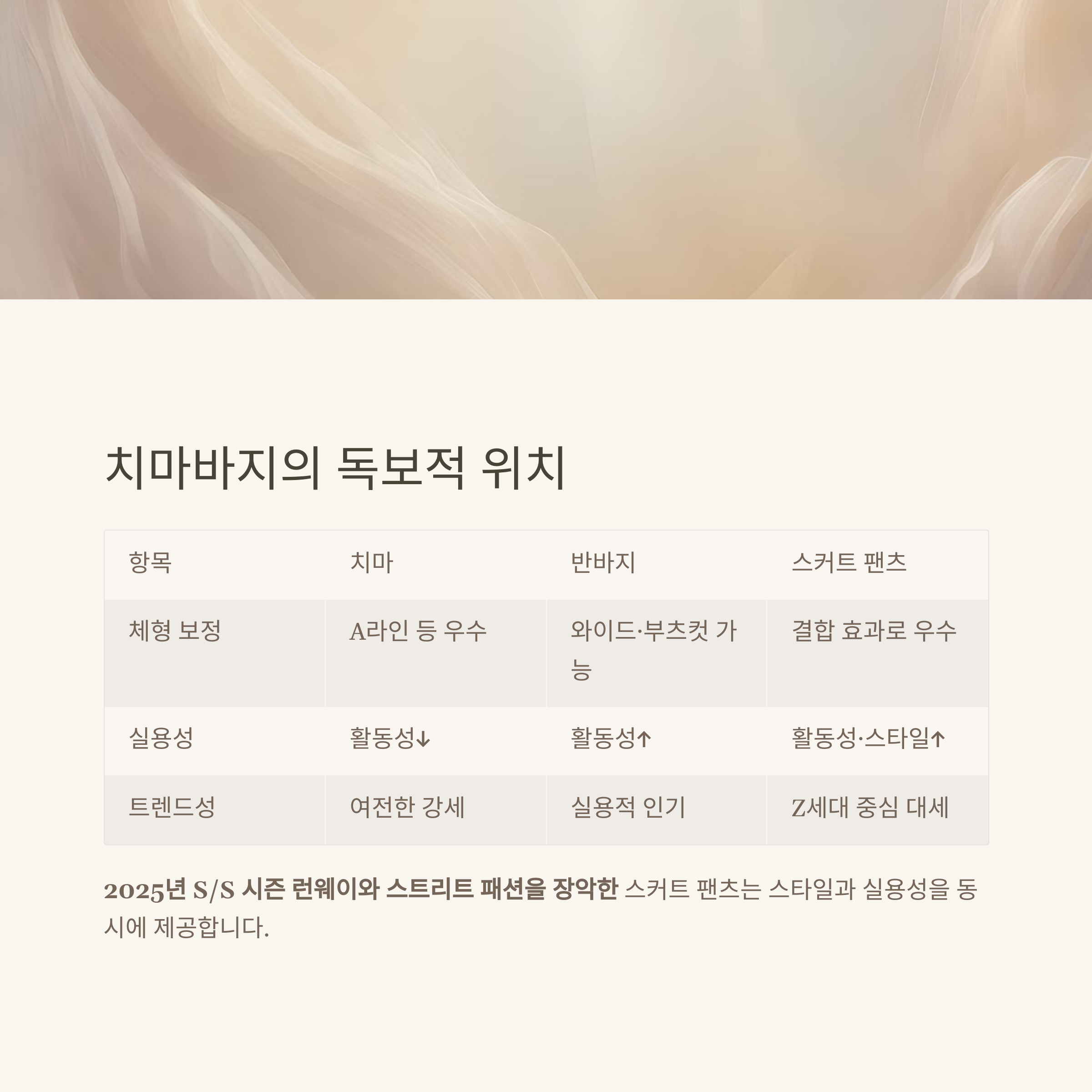 치마는 여전히 ‘여성스러운 분위기’를 대표하지만, 활동성과 편안함을 앞세운 반바지, 그리고 두 요소를 모두 아우르는 치마바지까지 다양하게 발전하고 있습니다.