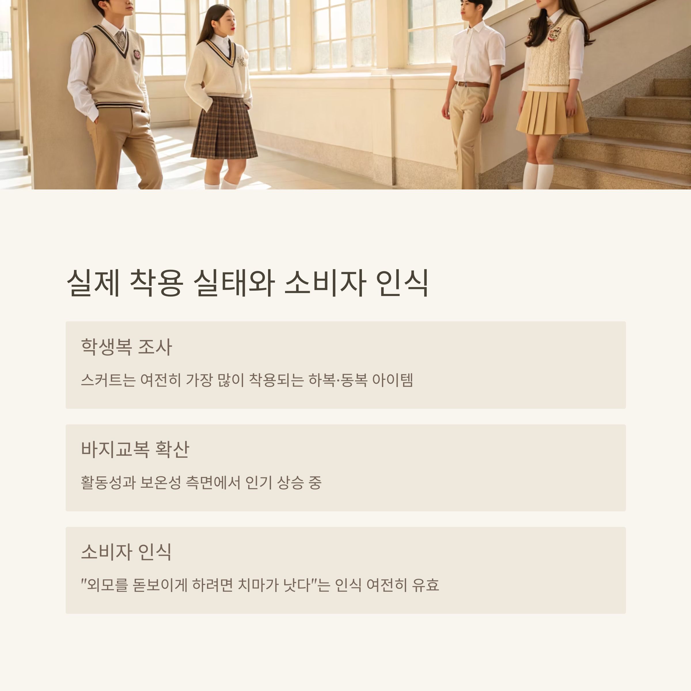 2024년 서울시 학생복 조사에서도 스커트는 여전히 가장 많이 착용되는 하복·동복 아이템입니다.