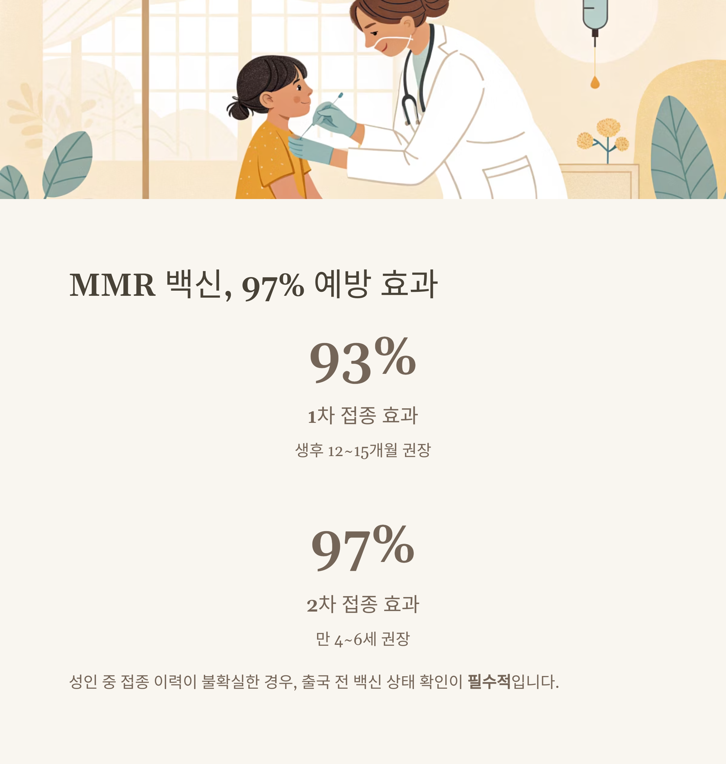 홍역 예방의 가장 효과적인 방법은 MMR 백신 2회 접종입니다.