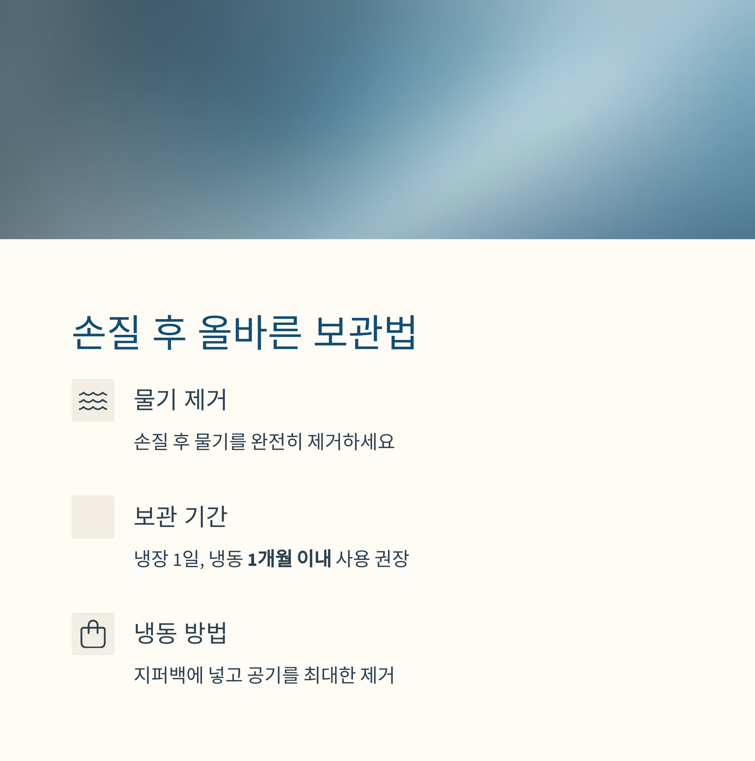 | 보관 | 손질 후 즉시 냉장 1일 또는 냉동 1개월 이내 |