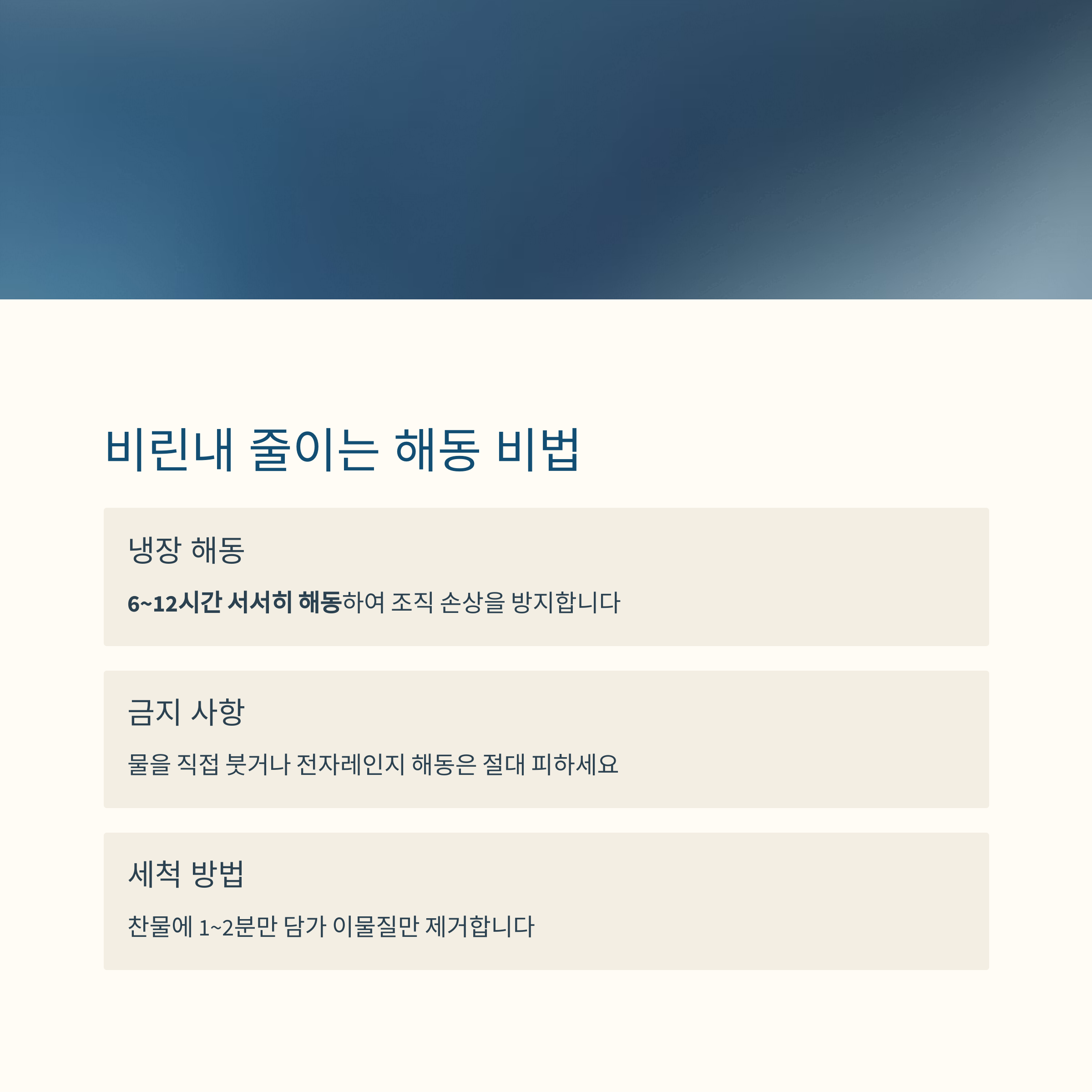 "해동에서 손질의 절반이 결정된다"는 말이 있을 정도로, 해동 방식이 결과에 큰 영향을 미칩니다.
