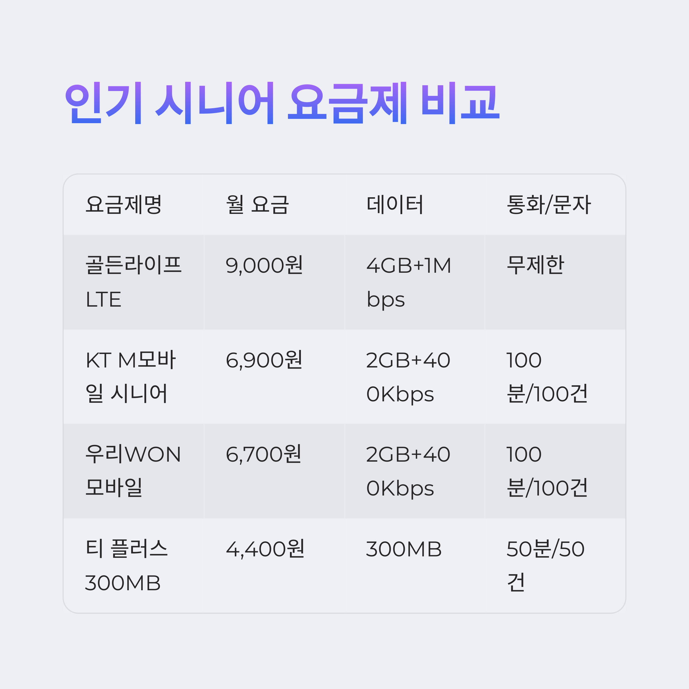 | KT M모바일 시니어 | KT | 6,900원 | 2GB + 400Kbps | 100분/100건 | 부가통화 30분 추가 제공 |
