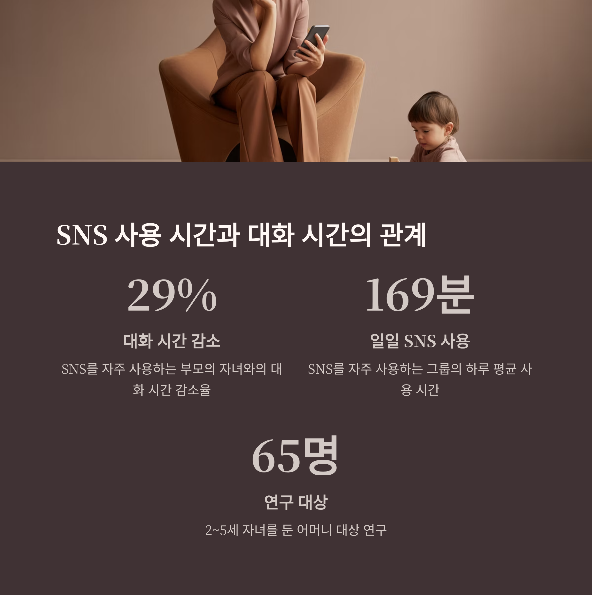 한 연구에 따르면 SNS를 자주 사용하는 부모는 그렇지 않은 부모보다 자녀와의 대화 시간이 약 29% 줄어든다고 합니다.