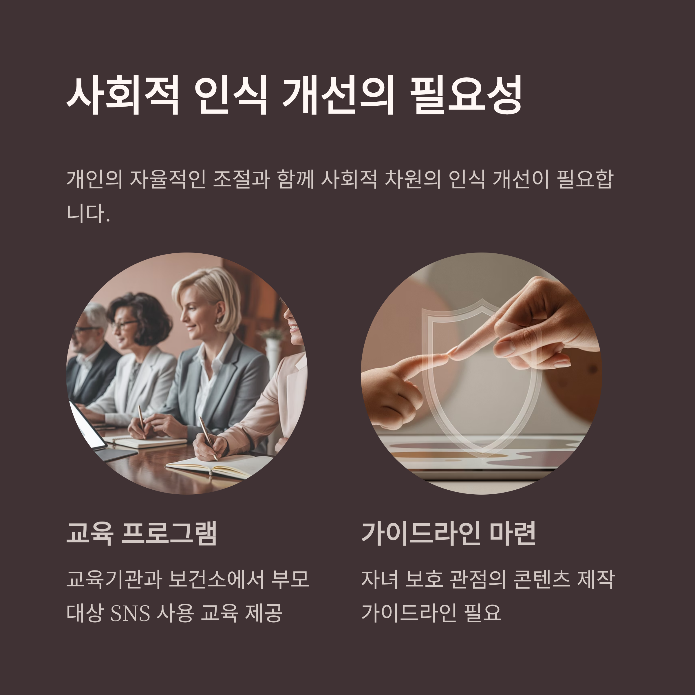 교육기관, 보건소 등에서 부모 대상의 SNS 사용 교육이나 워크숍을 제공하고, 자녀 보호 관점에서의 콘텐츠 제작 가이드라인도 마련될 필요가 있습니다.
