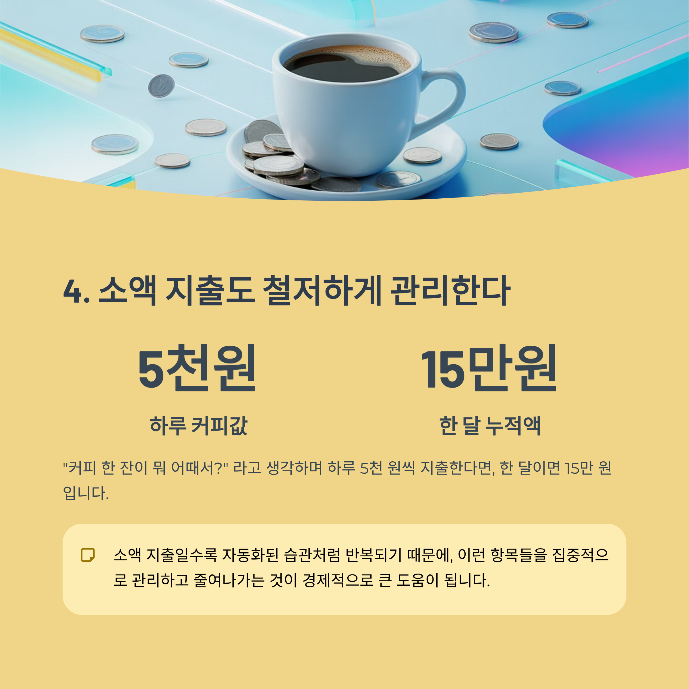 소액 지출일수록 자동화된 습관처럼 반복되기 때문에, 이런 항목들을 집중적으로 관리하고 줄여나가는 것이 경제적으로 큰 도움이 됩니다.