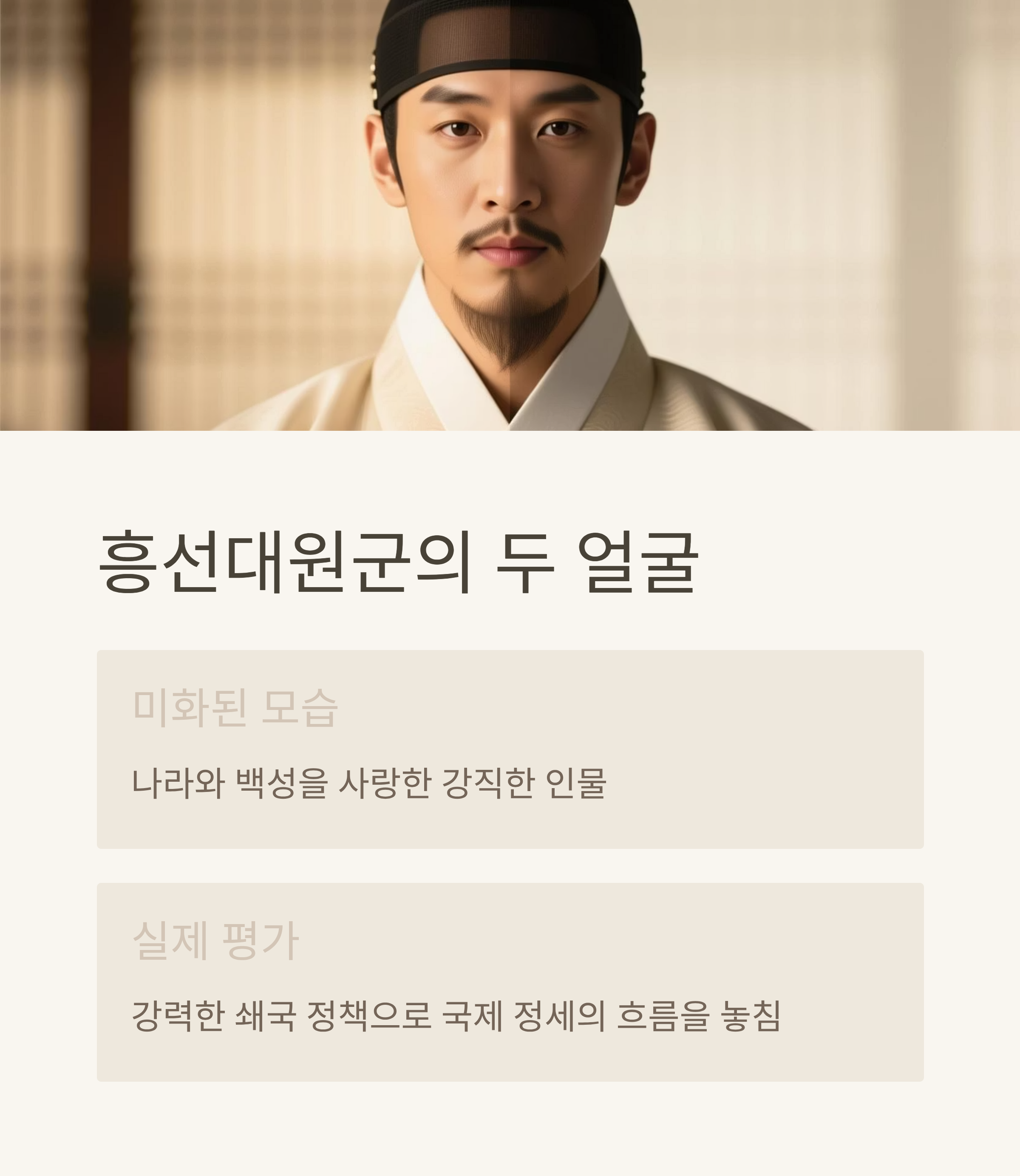 흥선대원군은 흔히 나라와 백성을 사랑한 강직한 인물로 알려져 있습니다. 그러나 동시에 그는 강력한 쇄국 정책을 펼치며 국제 정세의 흐름을 놓쳤다는 비판도 받습니다. 단순히 ‘나라를 지킨 영웅’이라는 한쪽 모습만 보여주는 것은 진실의 절반을 감추는 셈이죠.