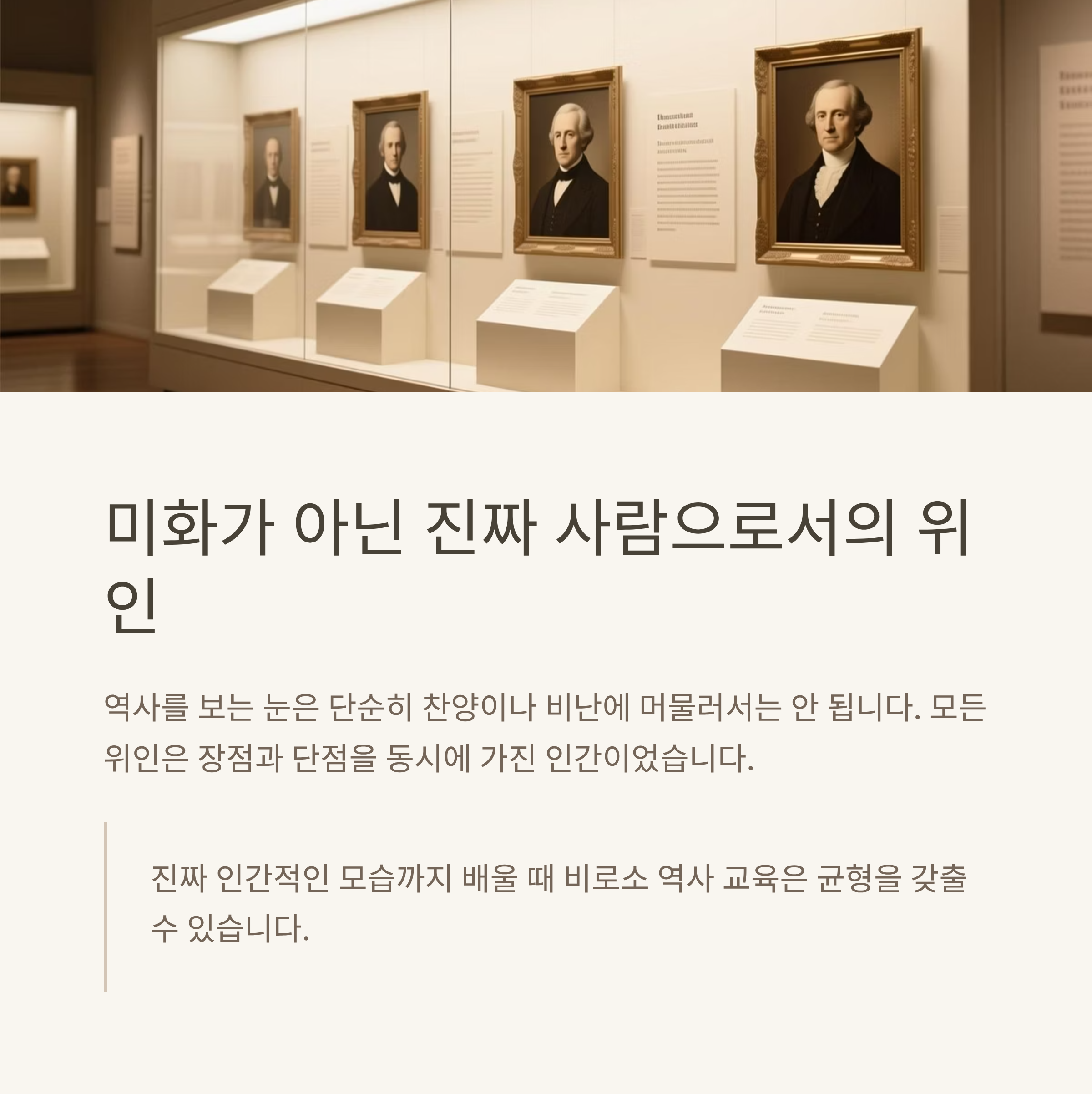 역사 속 인물은 영웅도, 악인도 아닌 복합적인 인간입니다. 위인의 빛과 그림자를 함께 다루는 교육이야말로 아이들에게 더 큰 울림을 줄 수 있습니다. 단순히 “존경해야 할 인물”이 아니라 “그 시대 속에서 고민하며 살아간 인간”으로 이해하는 것이 중요합니다.
