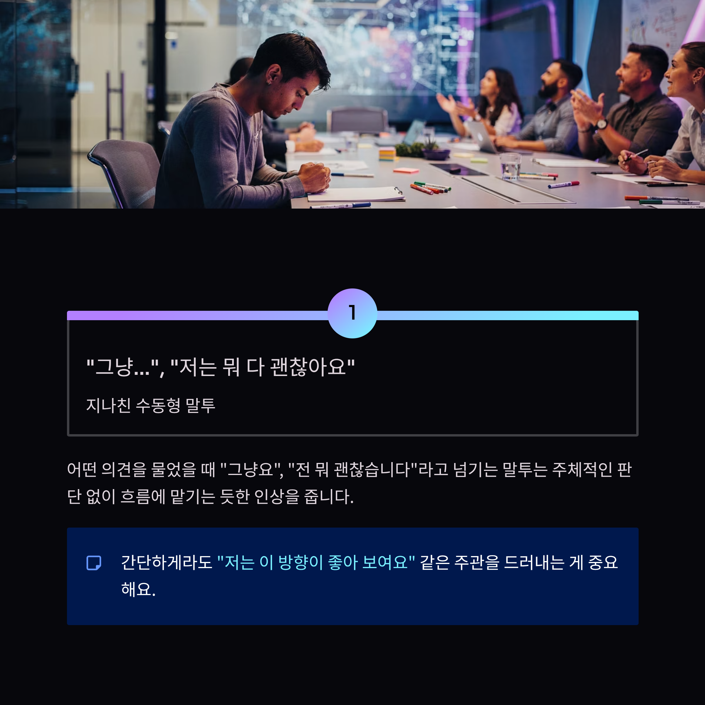 이런 말투는 자신감이 부족해 보이고, 결국 상대에게 우위에 있는 듯한 인상을 줄 수 있죠.