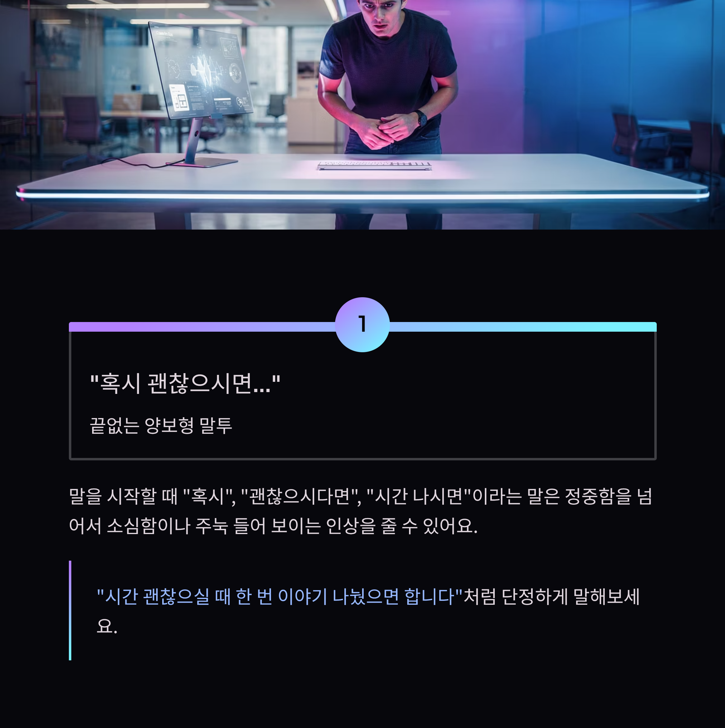 | 양보형 ("혹시…") | 자신감 부족, 우유부단해 보임 | "시간 괜찮으실 때 말씀 나누고 싶습니다" |