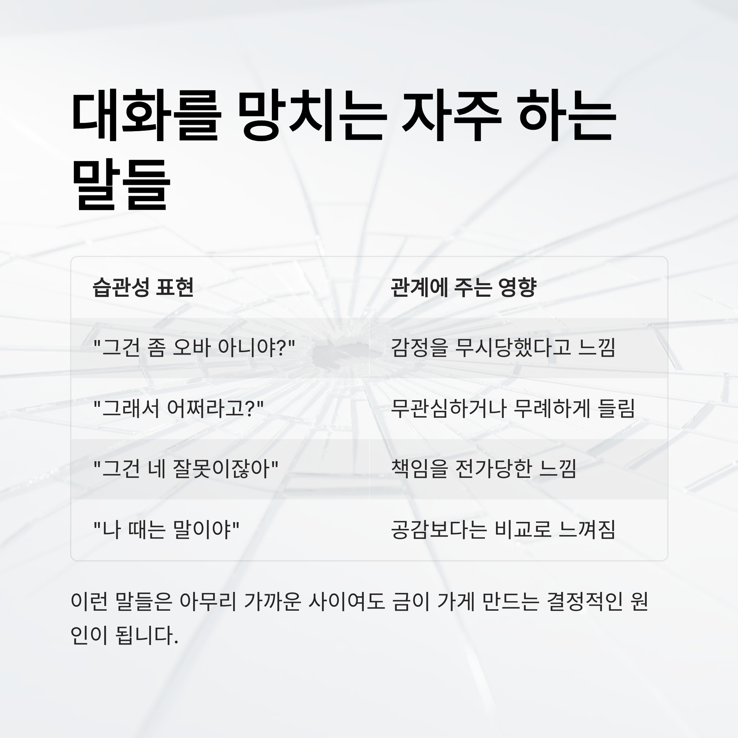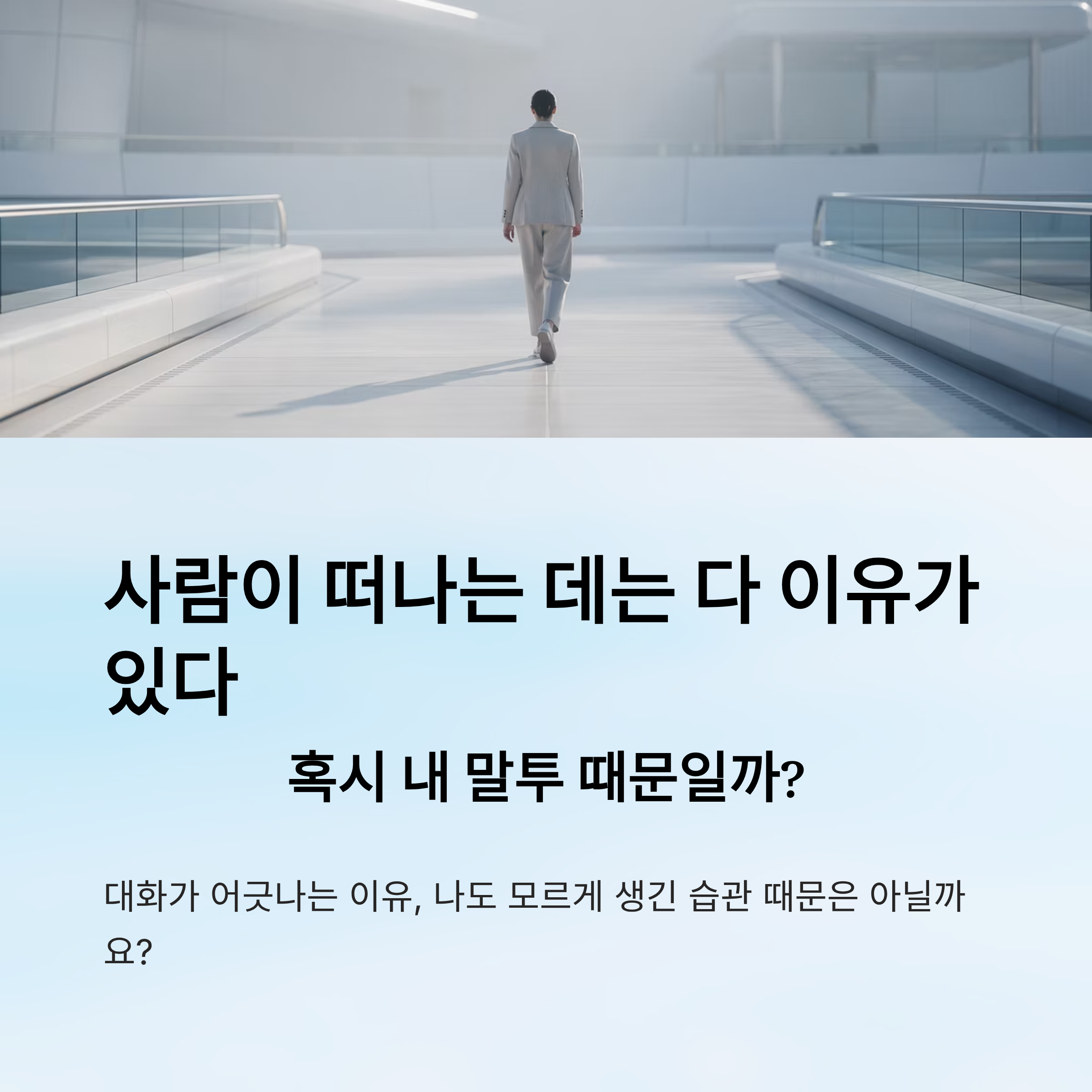 우리는 하루에도 수없이 많은 대화를 나누며 살아갑니다. 그런데 때때로, 가까웠던 사람의 마음이 점점 멀어지고 있다는 걸 느낄 때가 있죠. "왜 저 사람은 나에게서 떠났을까?"라는 질문을 하게 되는 순간, 관계의 틈은 이미 깊어져 있을지도 모릅니다. 이 글에서는 그런 순간을 마주한 여러분께, ‘혹시 내 대화 습관에 문제가 있었던 건 아닐까?’ 하는 작은 질문을 던져봅니다.