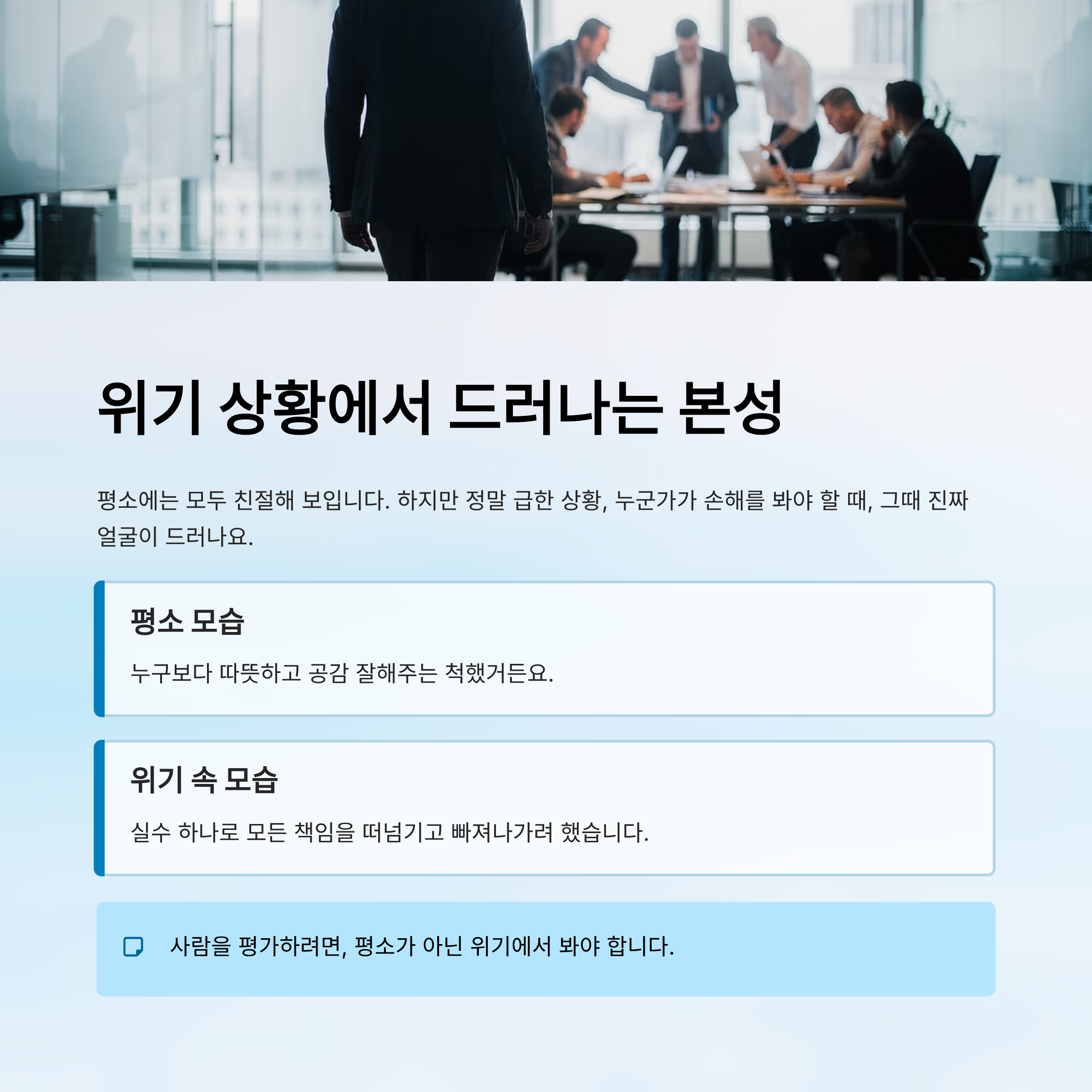 이런 걸 직접 겪어봐야 압니다. 사람을 평가하려면, 평소가 아닌 위기에서 봐야 한다는 걸요.