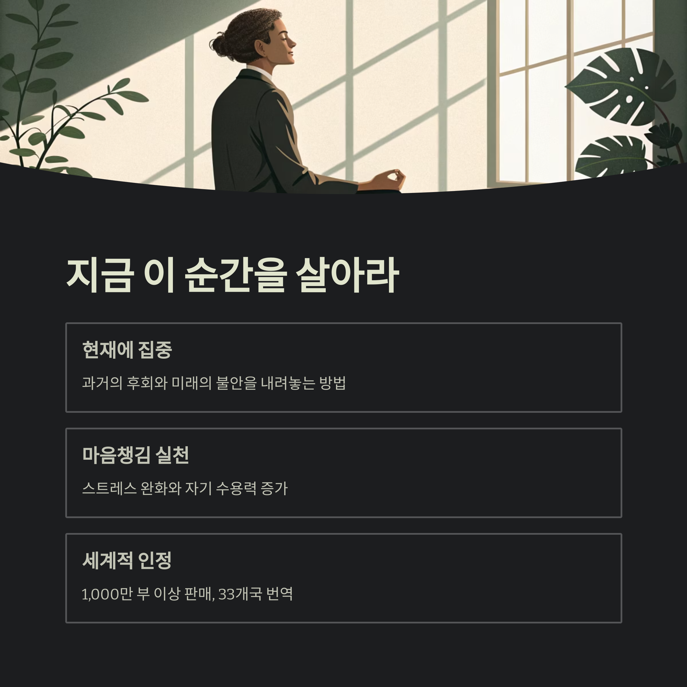 과거의 후회와 미래의 불안을 내려놓고, 지금에 집중하는 방법을 명확히 알려줍니다.