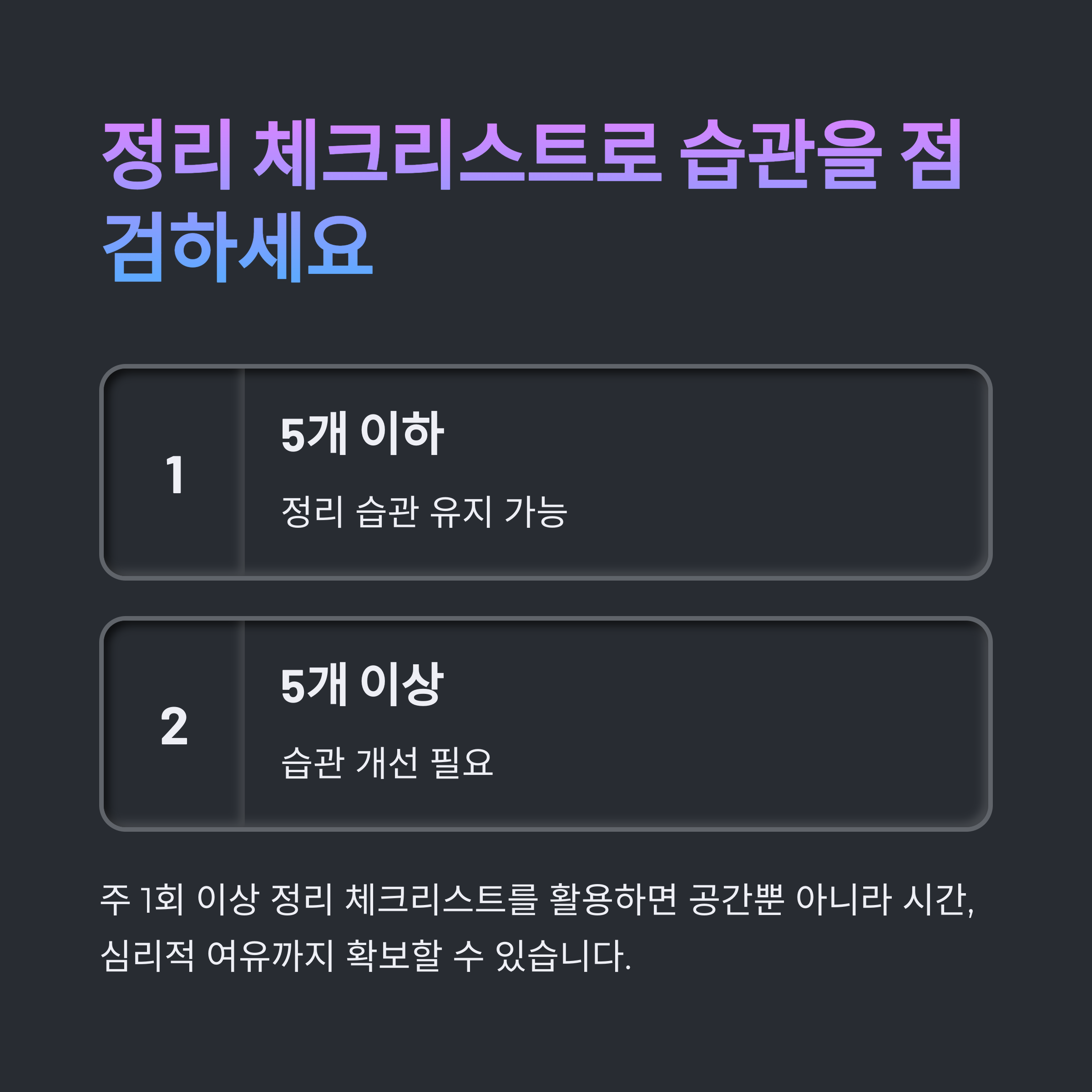 자신의 정리 상태를 꾸준히 점검하는 습관을 가집니다.