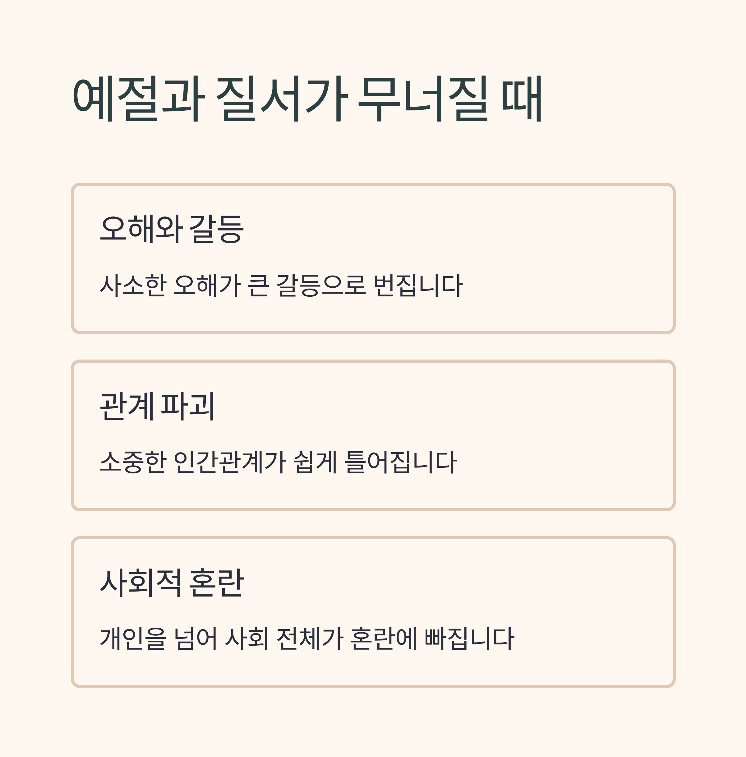 이는 단순한 예절이 아니라, 인간관계와 사회 질서를 바로 세우는 근본 규범을 뜻합니다.